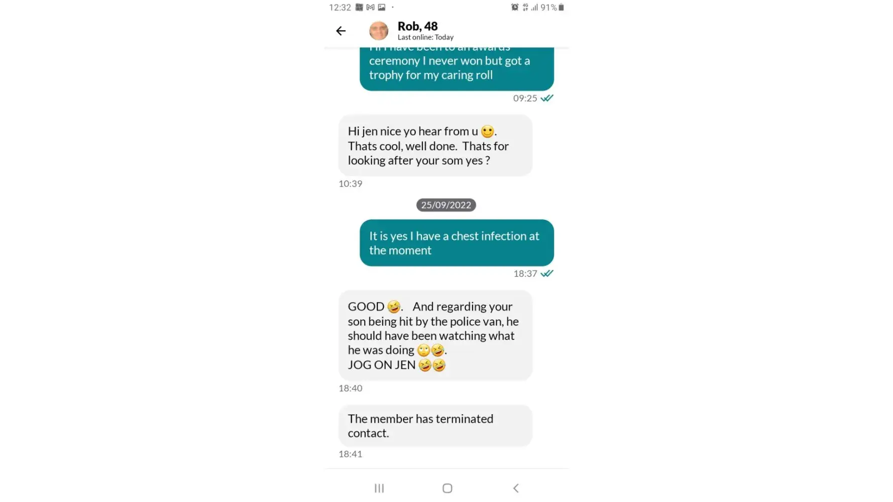 I have a screenshot of the nasty comments and he has terminated the conversation so I can't complain about him saying he is pleased my son was ran over that he should have been watching where I was going and that he says good I have a chest infection it is Rob 48