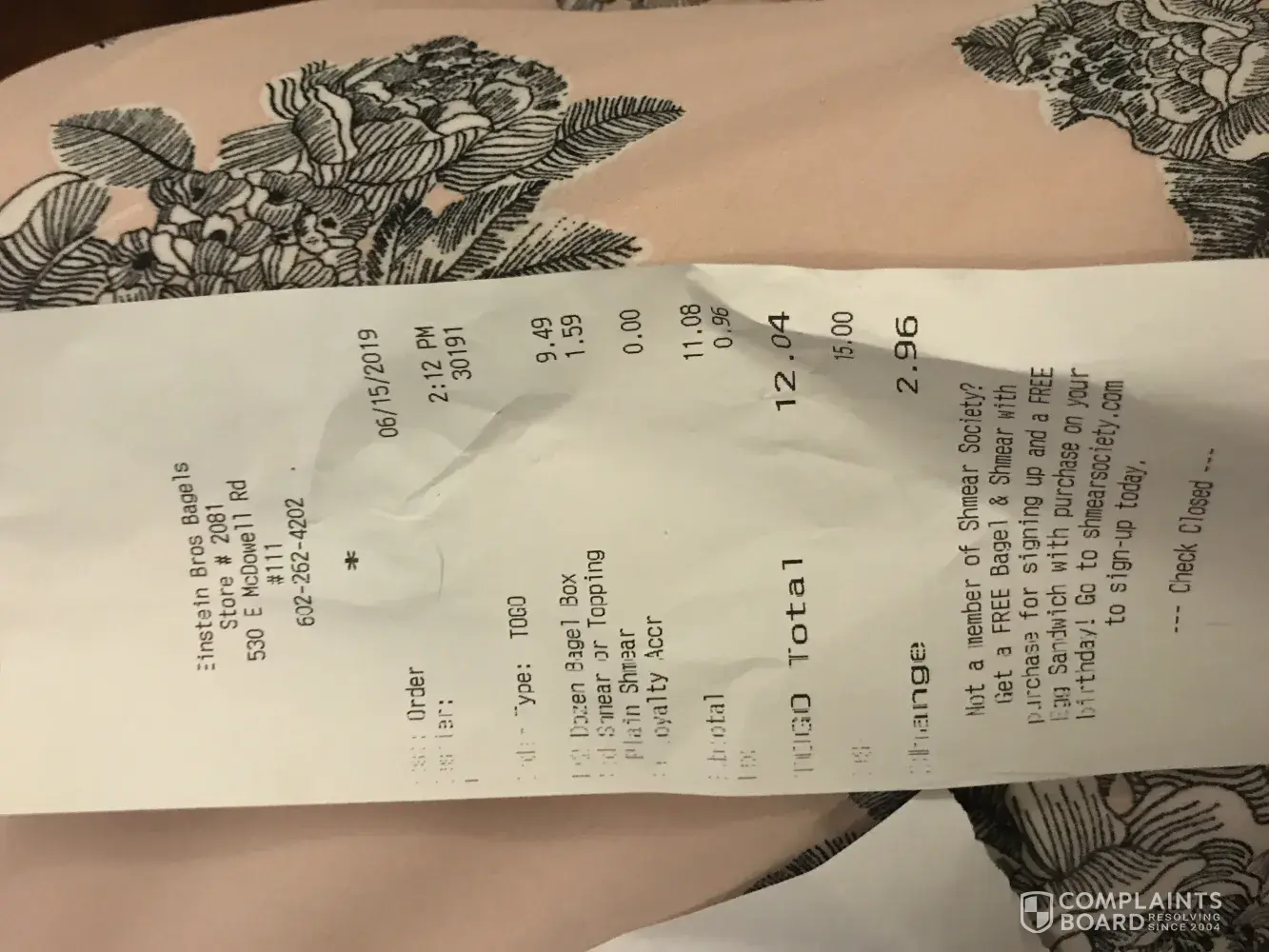 We drove up to our usual Einstein brothers Mt Rushmore Road, Rapid City, SD 57701 And spent $7.90 ordered a cold brew mocha latte tall, plus eats (which was ok) and short hazelnut coffee but got a hot brew of the former and black coffee instead of hazel nut. The worst part was no receipt paper, hence no survey hence no usual bagels as a complimentary...