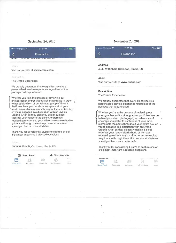 On Aug 14, 2015 my daughter received an email from Eivan's saying that they had assigned a photographer to her. She looked at this photographer's work and this was not what she wanted for her wedding photos. (Remember, they advertise that you can hand pick your photographer.) Several emails were exchanged between my daughter and Eivan's/ Sam Jalouga. Many of the emails were CC to their "legal" department. (Yes, they claim to have their own "legal" department! Do they have that many dissatisfied customers?) But they refused to let her choose the photographer that she wanted. When my daughter pointed out to Mr. Jalouga that he advertises " you can hand pick your own photographer...", someone changed Eivan's Facebook page to read " you can handpick your photographer style"...(See photo below.) Mr. Jalouga then told my daughter that she could cancel her contract for a full refund. Ok, great! My daughter cancels with them and no services or photography was ever provided by Eivan's. At least they are owning up to their false advertising that lured her in and they are offering to make it right by refunding my $1900. Wrong! To this day, Sam Jalouga has refused to refund my money and I seriously doubt that he ever intended to. There is no customer service with this company and I hope you never have to deal with all of the stress that Eivan's has put me through the past 2 years! Hopefully, I can save some of you from making the same big mistake my daughter did when she decided to go with this company!