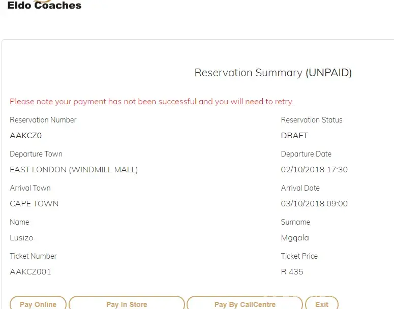 I made a reservation on 01/102018 for 02/10/2018 at Eldo coaches and used my bank card to make the payment.An error message popped out that the payment was unsuccessful and I will have to retry but the funds were not reversed bank to my account.I contacted the customer care and finally spoke to Vuyo after my calls were cut off for more than 5 times.He asked me to send email proof of payment and I did.I have not received any response from them until now and I have been unable to get through to the call center, after waiting on the line the call gets cut off.