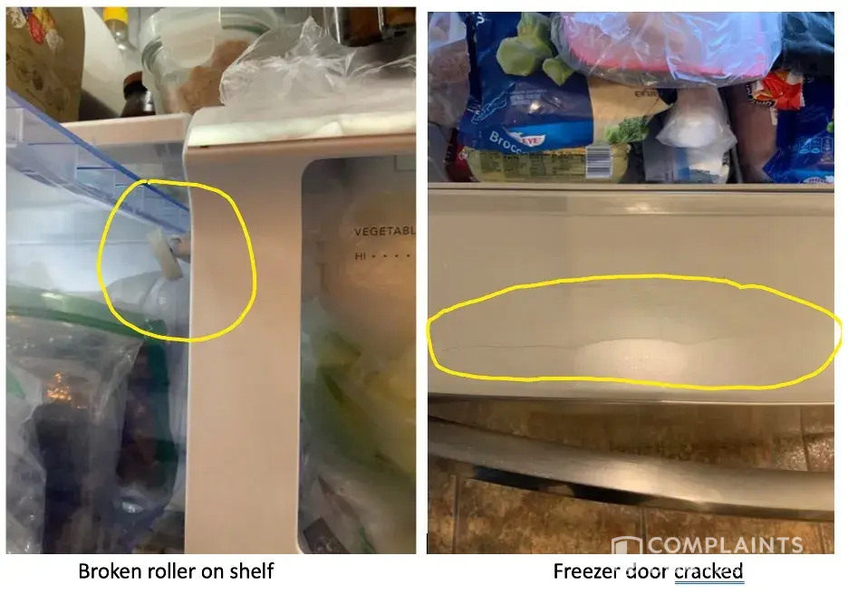 I purchased all new appliances for kitchen. Refrigerator has cracked freezer door, broken shelf support and contents of refrigerator section freeze. Extened service company says roller and door issue are 'cosmetic'. This is total BS and just a way to get out of replacing items. My question: Did your engineers design this product to break off or crack. If so, it's a marvel in engineering. Otherwise, I want them fixed properly. I've spent too much on these products to have this line of crap shoveled to me.
