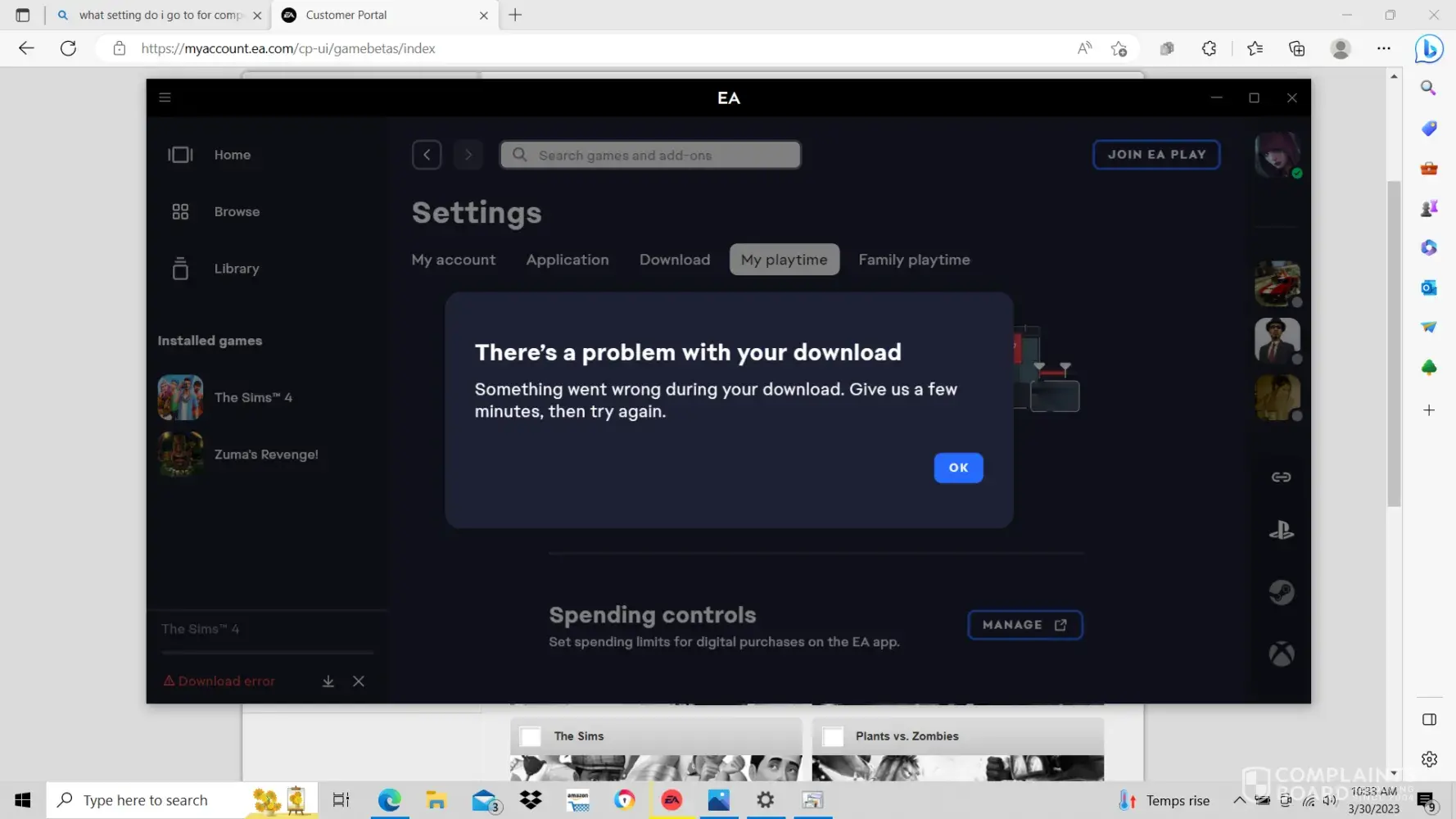 From the time I purchased the game May 5, 2023 until now I have written at least 10 EA Help requests. My computer was built primarily for that game with a 12th gen CPU, EVGA GeForce RTX 3070 GPU, 32 Gb of D4 RAMM, 2-1TB M.2 SSD, 2-2TB 2.5 inch SSDs, ASUS H670Pro WiFi, Windows 11 Pro, with all updates up-to-date. I have been unable to download the game using the EA App since it first went live and have spent at least 30 hours in the attempt.