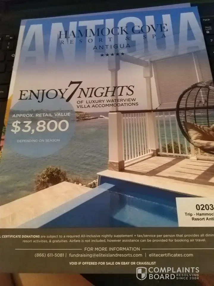 I disagree with the scam claim placed here. I purchased a certificate at a christian pre-school fundraiser. the certificate is for "up to 2 rooms" for a week and clearly states that the $125.00 upcharge per person per day for the all inclusive must be paid. time had lapsed and when I was finally able to plan a trip for just one of the rooms, after getting my plane flights locked in and paid, for dates that the resort had open online, I then went to reserve the room and my certificate had expired about a month prior. I contacted the headquarters via email and the staff was more then pleasant and accommodating. honored my certificate, booked for 9 nights instead of 7 to meet my airfare booking with no extra charge for the extra nights except the all inclusive fee. I upgraded to a beach front room and paid the upgrade fee which was very reasonable along with the all inclusive fee. the staff was not only pleasant but responsive in a very quick fashion also. when I received email communications back after the booking, I was pleasantly surprised to find out that my second week will still be honored at a later date for another booking at any of the elite island resorts. let me also add that my booking in antigua is during the busy season of spring break march. I checked all travel sites and there is no way I could book this same hotel room for the same amount I am now paying. even with the upgraded room my cost is about 50% of the current published available rates on expedia, trip advisor, orbitz and the rest. the only hiccup that I see is that the better restaurant will have a surcharge per person every time we want to eat in it. the surcharge is probably close to what a meal would cost. we are traveling there in about 6 weeks and I have no concerns, worries or feelings that someone scammed me or ripped me off as people have said here. and I paid - donated - a lot more money for my certificate then the person here did. I wonder if the person here called with an attitude to start and possibly got the attitude back? not condoning that for service but my experience is just so so different. I thank elite islands resorts and the rep chrissy that helped me. now lets work on that upcharge for eating in a restaurant after you pay the all inclusive fee. I won't mind it if the inclusive restaurants are fine, or the surcharge isn't actually full price for the dinner served.
