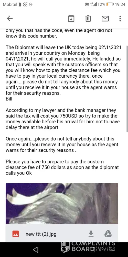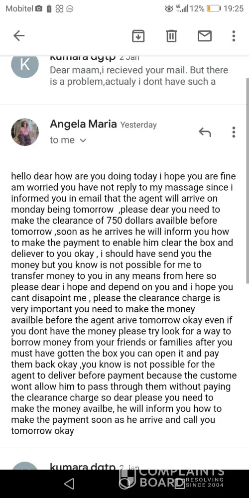 Будь ласка, ви маєте надіслати нам електронного листа прямо зараз, щоб повідомити нам, що відбувається, щоб ми зв’язалися з митницею в МОЛДОВА з приводу цього, а також майте це на увазі, якщо там у коробці буде знайдена контрабанда, митниця приїде після вас, тому що на скриньці вказані ваші повні імена, номер телефону, адреса електронної пошти, а також ваша домашня адреса, щоб вас там знайти, тож вам потрібно піти й внести гроші, наш агент сказав, що ви маєте здійснити платіж у розмірі 3500 доларів США, ми розуміємо, що ви вже здійснили платіж у розмірі 6500 доларів США, але ми тут, щоб дати вам гарантії, що як тільки ви зробите платіж завтра, і агент не доставить вам посилку, напишіть нам у відповідь і надішліть нам дані свого облікового запису, щоб ми могли надіслати вам назад усі гроші, які ви вже витратили, і ми притягнемо агента до відповідальності