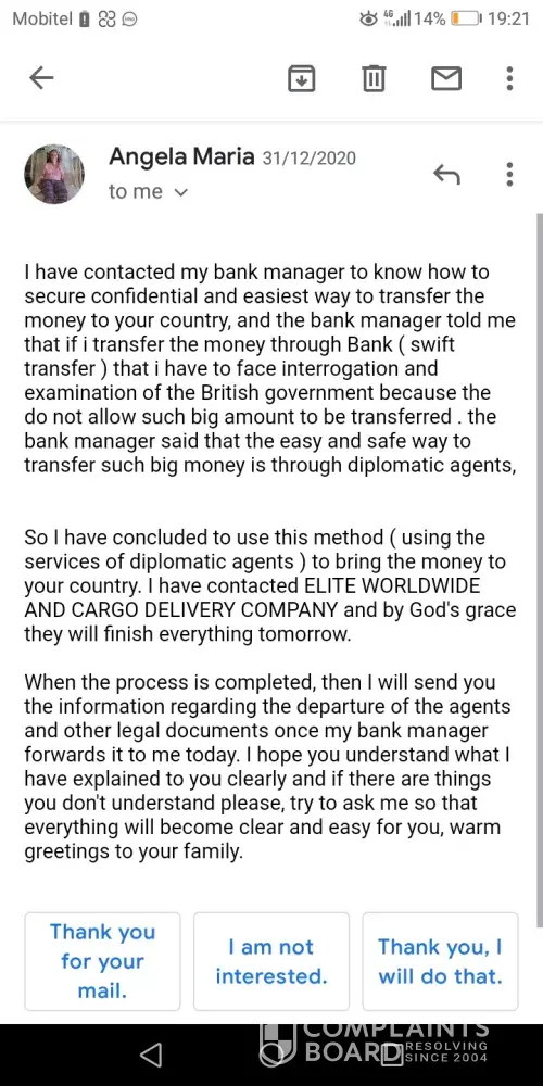 Elite Worldwide & Cargo Deliveries has received 13 complaints on ComplaintsBoard. The first reported case, 1 Million GB Sterling cheque Delivery, was published on Jul 22, 2010, and the most recent complaint, Fraud, was posted on Aug 21, 2024.