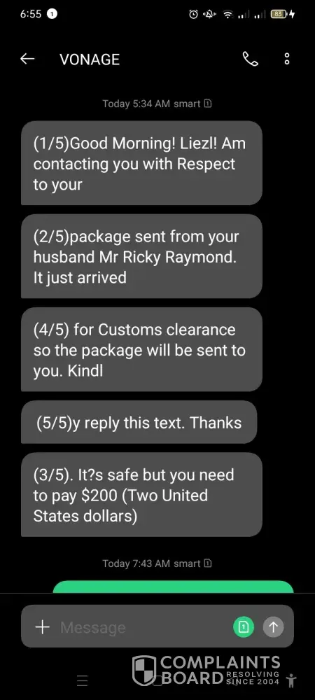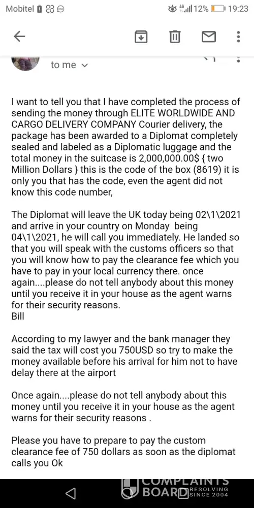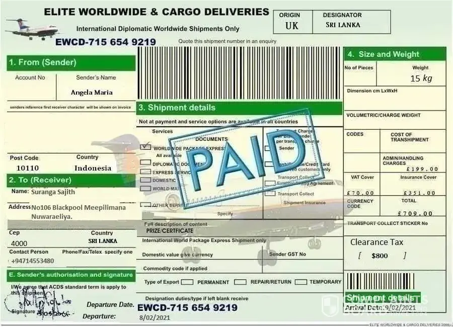 I received a message from elite worldwide cargo delivery th a they received a parcel under my name from UK at Victoria Falls International Airport and they want me to pay USD 200 for it to be cleared and delivered, is this true or its a scam