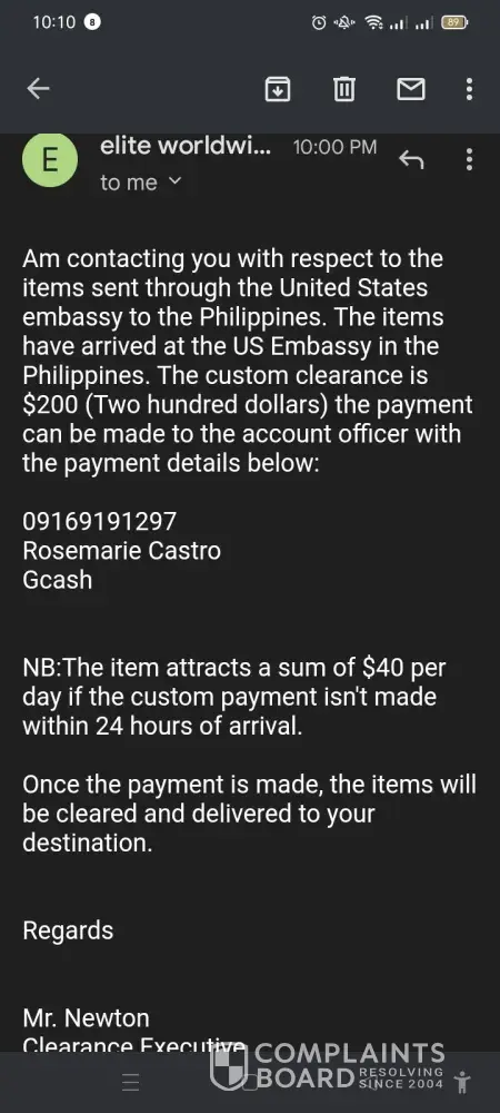 My friend send me a parcel worth of iphone and cash $3000. He told me the parcel is already here in the philippines. I go the email of [protected]@gmail.com. they said the parcel is already the costom clearance and i will pay $200.