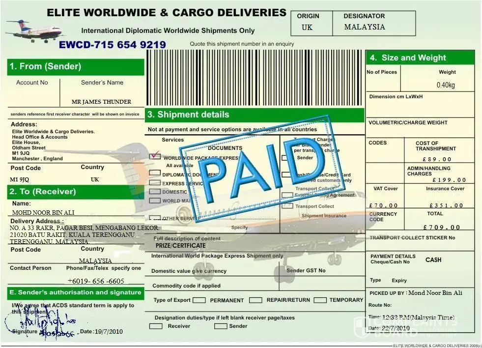 From: Elite courier delivery service [chat now] ... View contact To: [protected]@yahoo.com Elite worldwide & cargo deliveries. Head office & accounts Elite house, oldham street M1 9jq manchester, england. Fax number: +[protected] 5689 Phone number: +[protected] 7704 Date: 18/07/2010 Attn: parcel consigned:{mohd noor bin ali} you are welcome to elite...