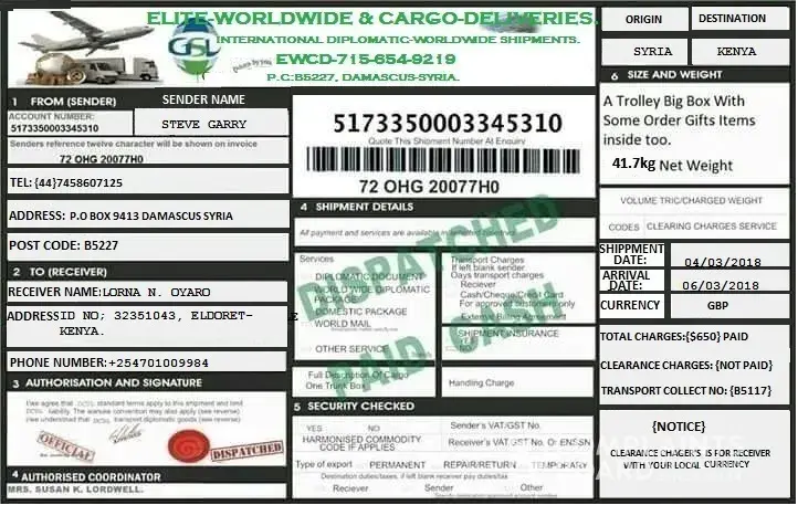 I was sent cargo from Damascus and i received a call to inform me that they have received it in their offices in my country Kenya. The asked me to send clearance money so that they may deliver it to my door which i did.The problem is their phone got switched off immediately and up to now there has been no further communication and it hasn't been delivered.
