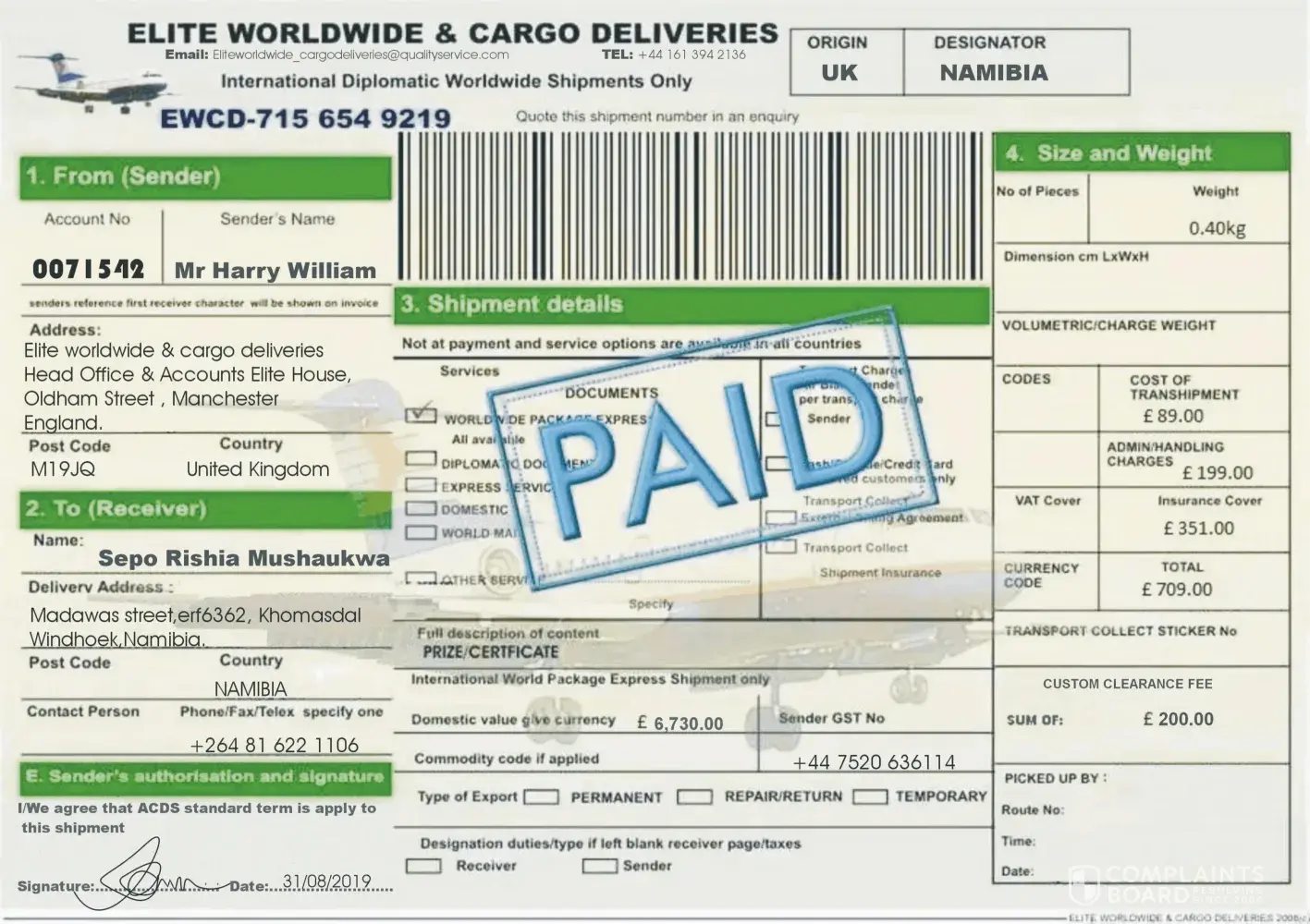 Elite Worldwide & Cargo Deliveries to verify consigned parcel