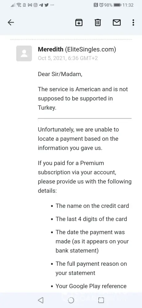 On Monday I have subscribed to EliteSingles.com via Google Play for membership and even though the payment was going through I was not activated as a member and as a paying member I have no access to any EliteSingles.com services. I immediately reported the matter to EliteSingles.com and also requested an immediate full refund from GooglePlay. On Tuesday EliteSingles.com claimed that they haven't received any payment from me asking for proof of payment. Google Play stated that they cannot refund me, because it doesn't comply with their refund policy. I have responded to EliteSingles.com by sending the proof of subscription via Google Play and the proof of payment, I still haven't received any response. I will not stop demanding until I get my money back or I will be activated and get full access just like other paying members but for additional duration since I have already been paying without being allowed to use. If it, EliteSingles.com, refuses to do any of the things mentioned above, I will take legal action.