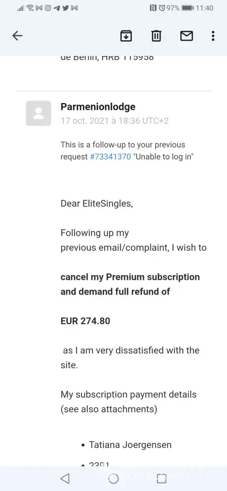 I joined Elite singles as a subscription on the 1st of January. I was having problems with the app and accessing the matches I was sent and then realised that they had charged me a full $329.70 for a subscription which showed a monthly charge at time of signing up. I was not prepared or in a position to pay this amount and after using the site and comparing to other companies was not satisfied and emailed to request a cancellation and refund. They have emailed back stating that as I used the messaging I was not entitled to the cooling of period even though it was within 2 days. I have again emailed with my details stating my consumer rights to enacting the filling off as without using the service I would not have known that I was not happy with the service and prepared to pay the fee. This is the complaint ticket number I received and the account is under Michele Baker [protected]