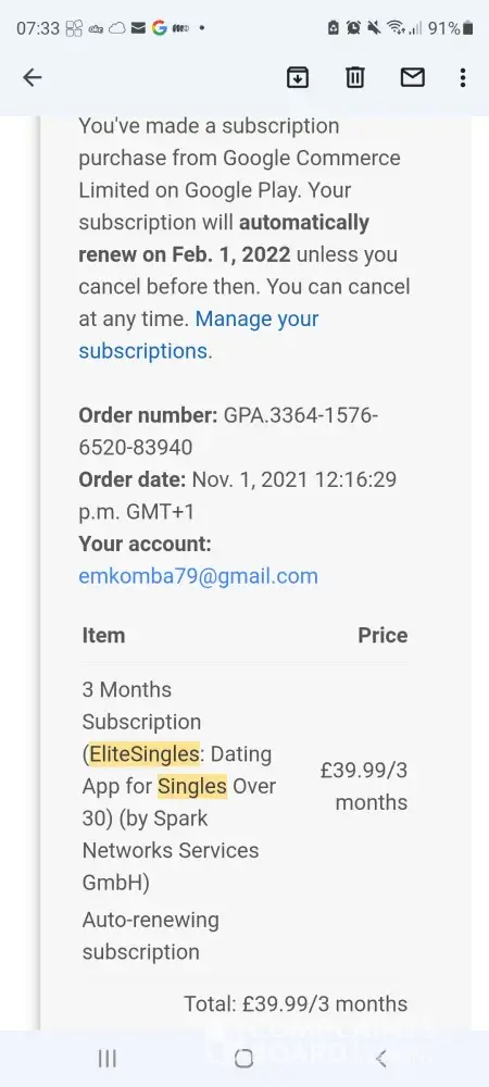 I am writing to you to complain about the costumer service provided by Elite Singles. Six months ago I have made an online account and paid to become a member. After six months, the subscription is renewed automatically without an email to remind you of it.