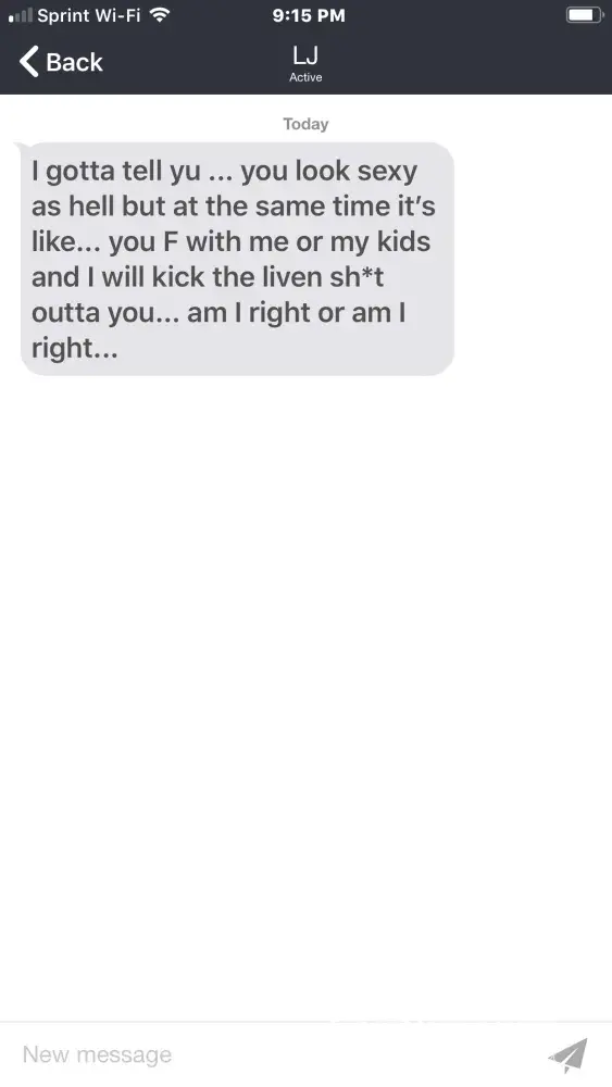 Please see attachment from a guy that just contacted me with a message through the EliteSingles site. I have never received such a brutal message from anyone and he must be removed from your site ASAP. He has threatened me in the message saying how sexy I look in my pics but if I "F" with him or his kids he would kick the living [censored] outta me! I am appalled at this type of behavior and that someone who is supposed to be a professional using this language and threatening me to find a soulmate! Absolutely disgusting! I would appreciate that you one contact this person and delete his account so he doesn't harass another woman as he has done with me. I did not nor will I respond to this person.