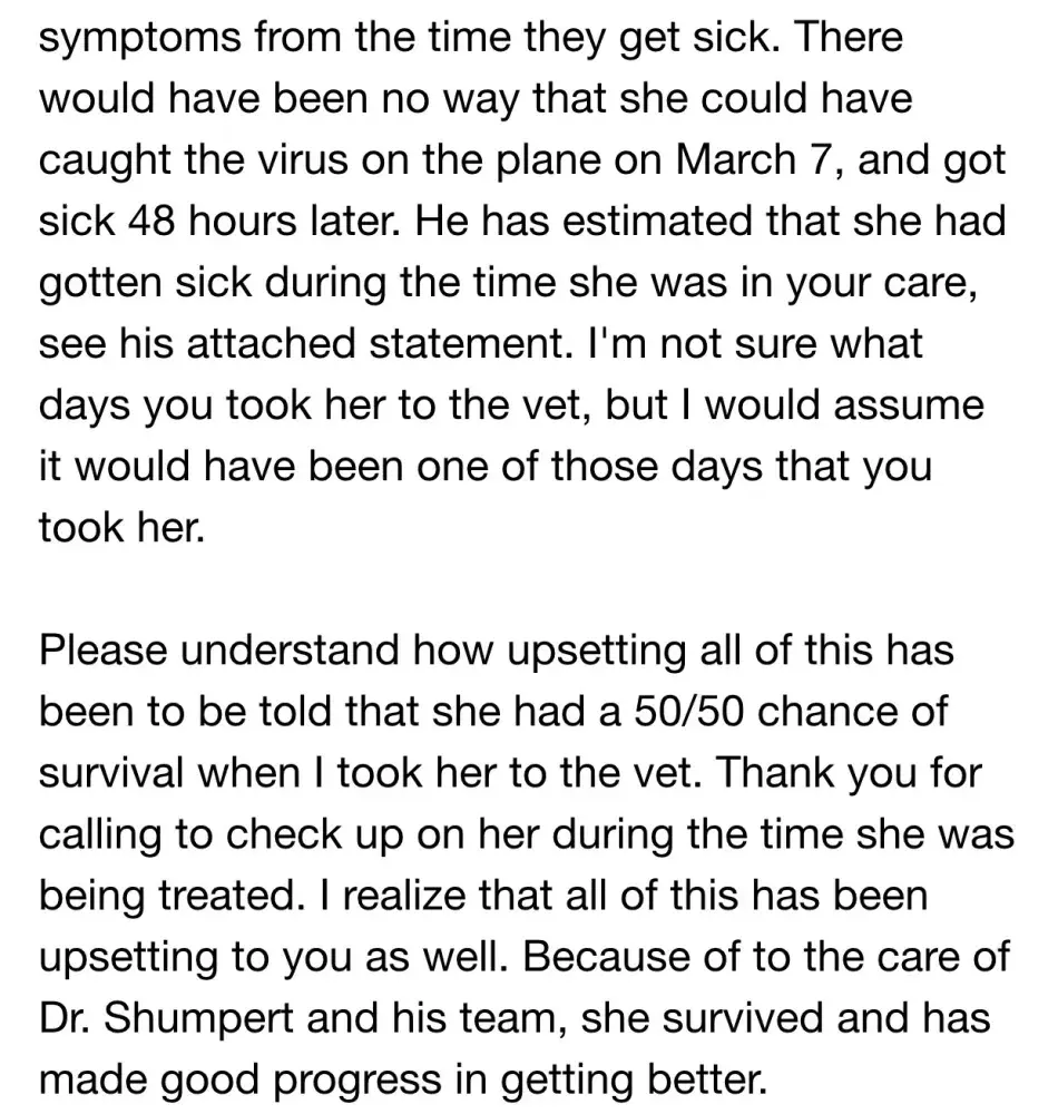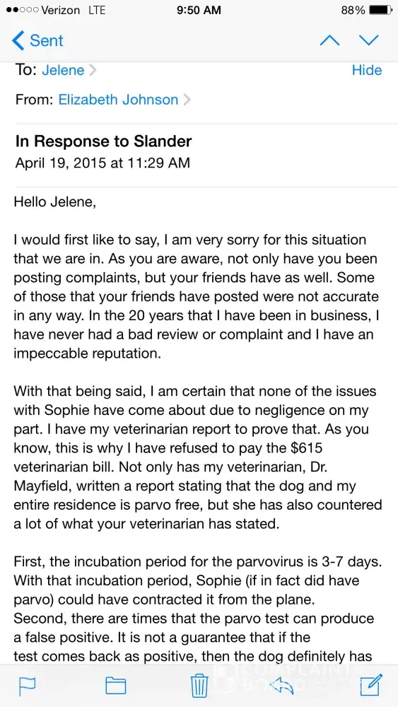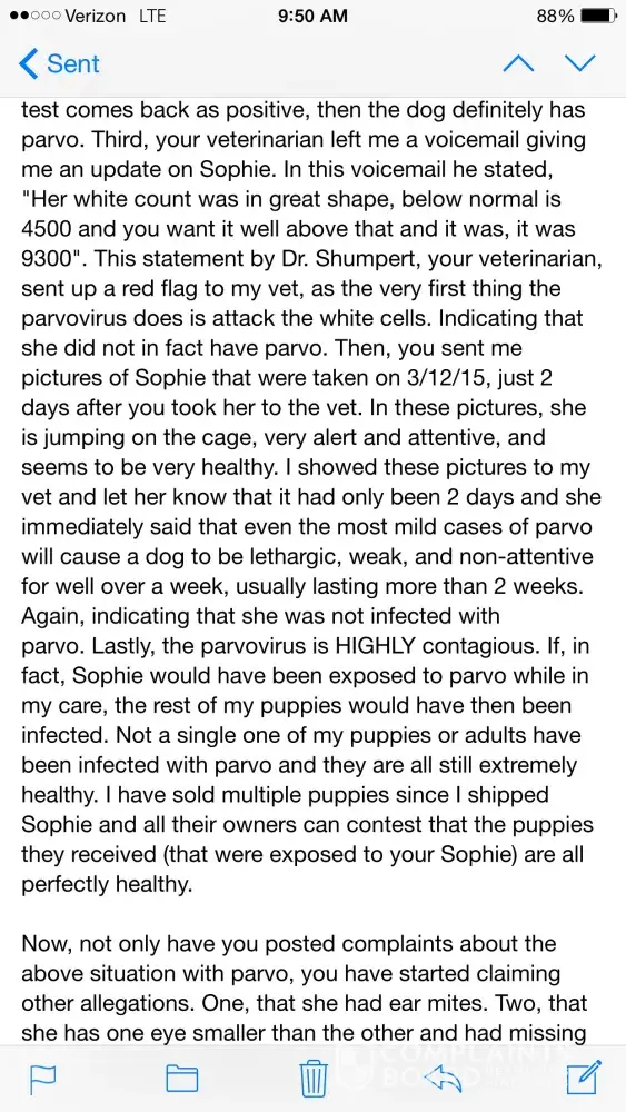 I just wanted to give an update on this situation. I did finally hear back from Jelene, but she is still only offering to send the vet bill and a statement from the veterinarian when I specificaly requested for all the detailed documentation to be sent. My veterinarian is demanding these records so not only she can look over them, but so Oklahoma State University can look over them to ensure the puppy did in fact have Parvo. Instead of wanting to comply with this request, Jelene is just wanting immediate payment for the bill. As I have been looking into this more, I have found other complaints on different sites from Jelene and now she has added more to the allegations. In fact, she has added things that she never even addressed with me and I am going to post a screenshot of those other complaints below. I have found multiple contradictions to Jelene's story and to me this disproves the validity of her statements. I will also attach a screenshot of an email she sent me where she states, "Thank you for calling to check up on her during the time that she was being treated. I realize that all of this has been upsetting to you as well." This fully contradicts her allegations that "this lady does not care about the puppy once they leave her hands. If they are sent sick, she is basically just like, 'I'm sorry' and then there's no more communication from her after that" (please reference photo attachment of Jelene's Yelp complaint for this quote). I am also going to attach a picture that she sent me of Sophie just 2 days after she arrived at her veterinarian. In this picture you will be able to see that Sophie is alert and attentive. Also, please notice that directly below Sophie there is another dog. Any ethical veterinarian is aware that Parvo is highly contagious and needs to be isolated and quarantined (and Jelene even states in this complaint that she was quarantined for 4 days), however in this picture it shows Sophie being exposed to another dog. I also have a voicemail from her veterinarian, Dr. Shimmery, the VERY DAY Sophie was taken to the vet. I would be more than happy to let anyone hear this voicemail, but in a his voicemail Dr. Shumpert states that Sophie is "happy and alert" and "we've had no vomiting". He also states that her white cell count was at "9300, well above the normal amount". Again, any veterinarian or anyone that has even the most basic knowledge of Parvo knows that the very day a dog comes to the vet and tests positive, it CANNOT be happy and alert. I could keep going on about this issue and could also post more screenshots of emails between Jelene and myself, but I do believe the above information will be enough to at least discredit the validity of her allegations. After 20 years of business, it saddens me that my impeccable reputation could be in danger due to lies and slander.