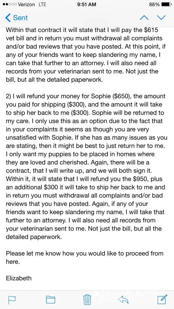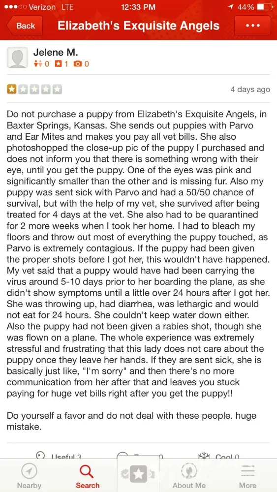 . Jelene is correct in saying, I profusely said "I am sorry", and this has been heartbreaking for me as well, but saying I am sorry, does not mean this puppy was sent to her sick or that I was negligent in any way. Since all of this has happened, Jelene, along with several of her friends have been spreading untruths about me. She has even added allegations that Sophie has one eye that is significantly smaller than the other eye and missing fur around her eye, which had never been mentioned to me, her veterinarian did not mention this, nor did he mention the ear mites. Sophie was checked for ear mites by my veterinarian right before she left and she did not have any, along with her eyes and they were perfect. Again, this can all be confirmed! I have deleted the post from her and her friends that were left on my Facebook page and other sites, but did a screenshot of them for verification before I deleted all the untruths being told about me. I would like to say I have been in business for 20 years and have an impeccable reputation. With that being said, after all the slander, I did email Jelene and tell her that I would pay her vet bill in full OR refund her fully for Sophie, plus the shipping that she paid and the shipping expense of her coming back to me, but she would have to sign a contract with me agreeing to take the complaints / slander off. I only want my babies placed in a home where they are loved and cherished, and with all that was being said about Sophie, I had doubts. I was not negligent or in the wrong in any way. I have not heard anything from Jelene. I have been on puppyfind.com since September, 2005 and have pages of glowing reviews. I take pride in my breeding program and the angels that I produce along with the customer service I provide. No expense is spared when it comes to my angels! I am attaching the last email that I sent Jelene as proof of the offer of a refund for Sophie or the vet bill to be paid. Anyone that has ever done business with me can attest that I have always encouraged people to do their research on the breeder and never jump into buying a puppy on impulse. I understand the internet can be a very risky place to do business, that is why I always talk with people over the phone and answer all their questions to put their minds at ease. I welcome any and all questions regarding this issue and have all the documentation from my veterinarian, all emails and correspondence between Jelene and myself, and the slander that has been told. If you are considering one of my angels and have any concerns due to this complaint after viewing all the information, I would recommend that you continue looking for the puppy that is right for you. I want anyone who adopts one of my angels to be 100% confident in Elizabeth's Exquisite Angels. Lastly, but MOST IMPORTANTLY, I want Sophie to be well and have a wonderful life!