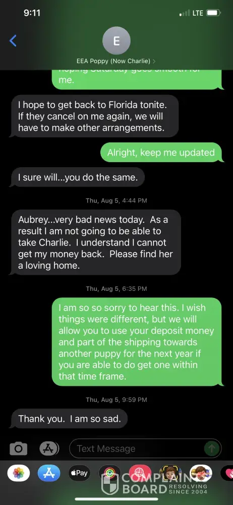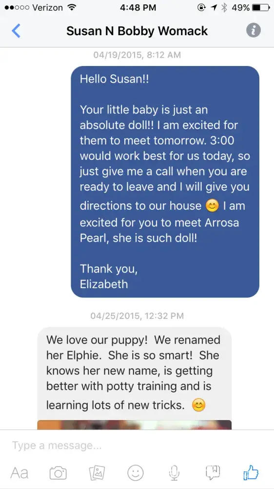 Screenshot between Kathy and I, where she even states she knows she can’t get any money back for the original puppy she purchased Poppy. And us allowing her to still put that towards another puppy.