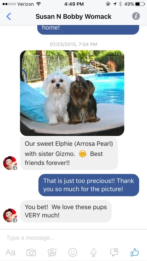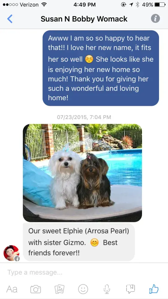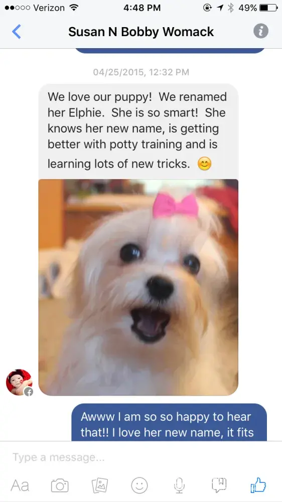 Susan and Bobby came to personally pick up precious Elphie on 4/19/15 (yes, nearly a year before she sent us this message). They both came and met her and fell in love. They saw our facility and it is quite obvious we take great care of our puppies and the parents. She purchased Elphie and at the time she did ask how to take care of tear stains. Elphie was nearly 6 months old when she was purchased and barely had any as we always take care of tear stains. I let her know that we use Eye Envy for any tear stains (I showed her the actual product we use) and also let her know that many people will trim around their eyes as tear stains are common in all Maltese. She stated she didn't want to cut her hair at all, but that she would get the Eye Envy. It is common knowledge that Maltese have tear stains and there are many reasons as to why they are caused. After Susan told us that it was due to bad breeding (which is COMPLETELY false) I consulted with our veterinarian. He actually laughed out loud when I told him was this other vet supposedly said. He said that it couldn't be further from the truth. As to her complaints of Elphie's personality, I am going to attach screenshots of 2 updates she gave us before this message was sent to us. One was from 1 week after purchase and the other was from 3 months after she purchased her. You can clearly see how much she loves her and that she had no complaints at all! This is the VERY FIRST time anyone has ever complained that one of our puppies had this issue and was not well socialized. She even admits to seeing MANY reviews about our puppies that the customers have said the exact opposite of her! Elphie was in perfect health when she left our care and we are sad to see that something about her environment now has caused her to have such issues.