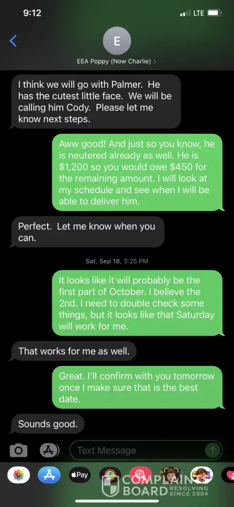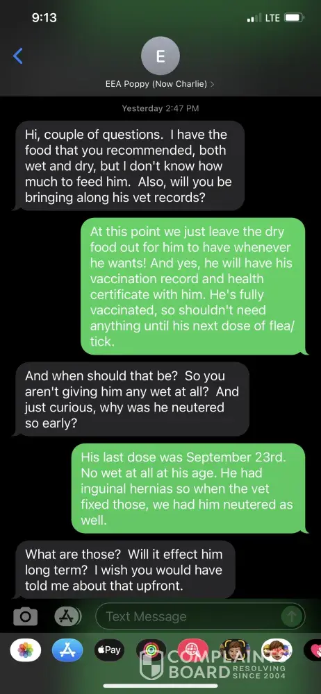 Let me tell the full story. Kathy originally purchased a puppy from us, Poppy. She had put down the deposit of $750 as well as paid for shipping, $650. With the shipping I had purchased my plane ticket to Tampa, FL. 2 days before Poppy was to go home, Kathy informed us that she would no longer be able to take her and she understood she couldn’t get her money back. I advised her that we would be more than happy to extend her deposit to another puppy of her choosing for one year. (Although our contract, that she signed, states deposits are NON-REFUNDABLE) A couple months later she contacted us stating she was ready for a new puppy. She wanted one that was mellow so I advised her we had 3 puppies currently that would be more on the mellow side. She chose Palmer and I told her at that time that he was also already neutered, to which she stated “Perfect.” Because Palmer was cheaper than her originally puppy, I advised her she only owed another $450, and I didn’t even charge her for an additional plane ticket and purchased that myself to personally deliver him to her to Tampa. The day before he was to leave, she was asking questions to prep for his arrival and at that point asked why he was neutered (although this also could have been asked weeks ago when I advised that he was neutered, it was not that she just saw it on the website. I TEXTED HER TELLING HER HE WAS, and I will attach pictures of the conversation). I did not hide the truth on why he was neutered and stated that when his hernia was fixed, we neutered him as well. I advised her that if she was uncomfortable with that we could refund the $450 additional that she had already paid and she could choose another dog. I advised that since it is the day before if she chooses one of our puppies, I couldn’t fly out the following day and IF there are any coats associated with changing my flight she would incur that. Which is more than fair considering we did not even have to apply the deposit in the first place and I PAID FOR THIS TICKET MYSELF. She ended up choosing to have the refund of $450, which I promptly did within minutes. What Kathy is failing to tell you is that we had been kind and generous with letting her apply the deposit when we did not need to and she actually is not out any money that she shouldn’t already have been since she backed out of the original sale 2 days before that flight was supposed to happen. I will be attached all correspondence to corroborate this story.