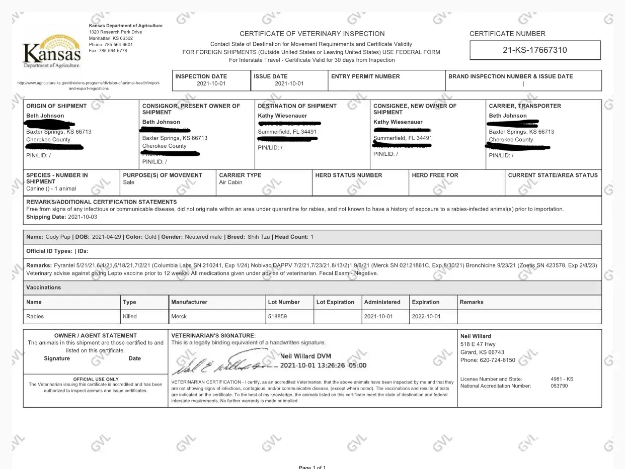 And lastly, here is Palmer’s (Cody, as she had renamed him that) health certificate from the vet on 10/1/21. Just to assure everyone that he was in perfect health. To go to Florida you must also get a fecal done as well as turn in every serial number and expiration date of every vaccination and worming given.