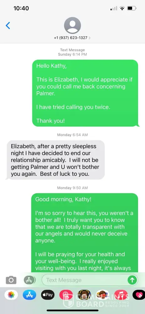 I would like to give a full update on the situation with Kathy Wiesenaur. After being threatened with lawsuits over not returning the initial $750 deposit for POPPY and $650 for shipping for POPPY, Elizabeth called Kathy to discuss everything. It was a lengthy conversation that ended with Kathy asking if she could still have Palmer and stating she still wanted him. Elizabeth and Kathy both agreed that the following day Kathy would call her vet to go over everything before she fully decided, so her mind could be put to ease. The following morning Elizabeth received this text. It was also during this conversation that Kathy finally understood the remaining $1, 300 that she had paid to us, was for a totally different puppy that she backed out of getting 2 days before I was supposed to fly to Florida to deliver her. We only wish her the best and hope she finds the perfect baby for her.