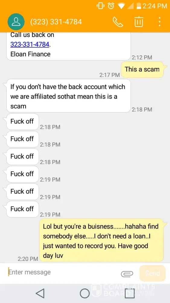 This is the text message I recieve from them after telling them I wasnt interested... They figured I didn't have a bank account. When the phone ring... Unprofessional the make answered the phone and said hello.. When I told him what it was about he cleared his throat to try change how he was speaking. I told him I was unable to hear him he said well i'm not going to tell you again so listen... Ha ha ha