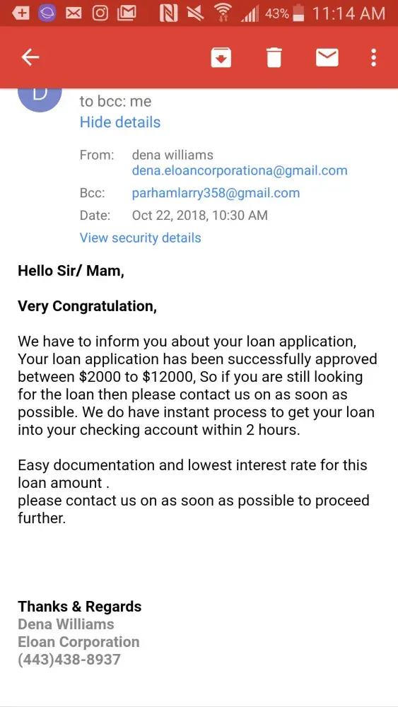 Dena Williams number [protected] emailed me and mentioned I got approved for 2000 to 12000 dollars. I called and they mentioned I would have my loan in 24 hours after I sent last pay stub my, state ID, and 30 day bank statement. I want to know is this a scam so I screenshot the email and needed to know as soon as possible is this authorized by eloan or us it a scam? I need to know immediately and right now, please!