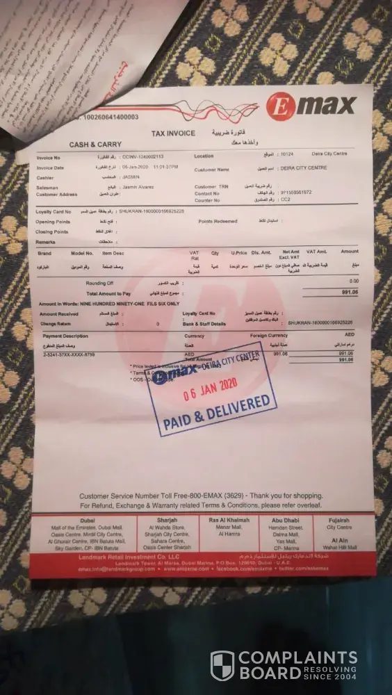 On 09th OCT 2020, I made a payment of 4899/- aed towards the subjected laptop which I collected from Mall of the Emirates branch because Deira City Centre branch doesn't have the product. Mr Sanu Magar was very helpful from start to end with the purchase. I hardly used the laptop because since the day I purchased it was working at all. Initially it used to stuck while using, secondly the same happens but with huge noise and finally it was not able to turn on at all. I left uae and went to calicut, India. When I contacted DELL customer care, they informed they will not assist even though i had international warranty on the laptop ie BQW8HX2. I had to fly back to Dubai, UAE in order to have the issue resolved by bearing flight ticket and visa expenses. On 13th NOV 2020 I returned the laptop to Mr Omar at Deira City Centre EMAX. He told will get back to me, which didn't happen. On 18th NOV 2020 I visited the same place and met Mr Sanu who assured me will draft a detailed mail to the concerned department and help me to get a credit note because the laptop is dead on arrival (DOA). He also promised to call or have the IT team call on the same day before 1300 PM which did not happen. On 19th NOV 2020 Omar called and informed they are working on it and will get back to me on Sunday ie today which didn't happen. I called him at 1518PM and he assured that will call back before 1800PM which also didn't happen. I sent him an sms requesting the status and he called back at 2133PM. He informed me the technicians from DELL confirmed that there is an issue with the HDD which they will replace and get to me within two working days. I told him clearly stating 4899/- aed is a huge amount for me. I had to work really hard, earn, save then purchase this laptop. At no cost I am willing to get a repaired or refurbished laptop. As promised by Mr Sanu I need a credit note or a brand-new DELL LAPTOP - 7590-VOS-E1393-GRY with a new unique serial number. Mr Omar said will WhatsApp me an email address to register a complaint which he did not do as of now ie 2326PM even though I sent him a reminder sms to do so.