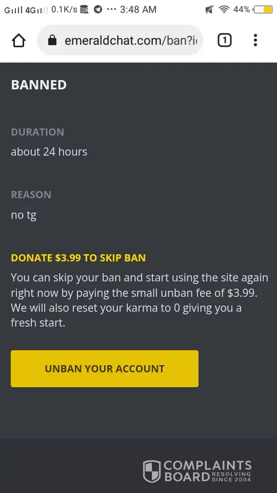 So, I was on Emerald Chat for 20 minutes, and then I had to go to the bathroom. When I came back, I saw that I was banned. Apparently, some people gave me "negative karma points," but I didn't do anything wrong. It's really sad that you can't even use this site because of all the trolls. It seems like they make money off of people trolling because I could pay $5 to get back in, but I would probably get banned again in less than 20 minutes. That's just stupid!