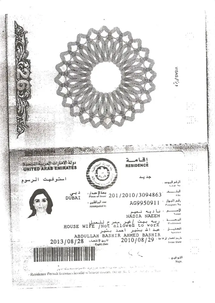 My name is nadia naeem passport number ag 9950911 and residency file number 201/2010/3094863 and my sponsor's passport number is aj 3845182 and his name is abdullah bashir who is now my ex husband. Abdullah bashir is a pilot with emirates airlines who's staff number is 400554. Abdullah and I are no longer married but he is still retaining my residency. I have my final divorce certificate which proves that we are now no longer husband and wife. Abdullah has confiscated my passport and has no intentions of returning it. His contact details are [protected], d64, cedre villas, silicon oasis. Please help me to get my passport back and get my residency cancelled. I'm attaching my divorce certificate, copy of my passport, copy of my residency and abdullah's national identity card copy.