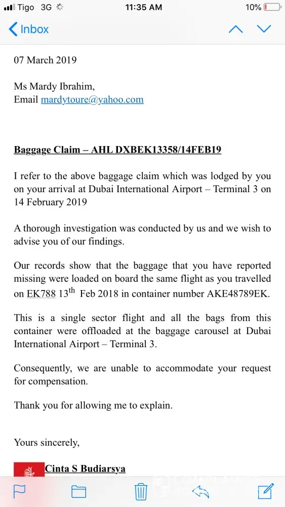 After reaching Spain we called their customer service who asked us to file an online complaint with Emirates which we did but they sided with the agents by sending a templated initial response and just did not answer our questions or any futher emails.