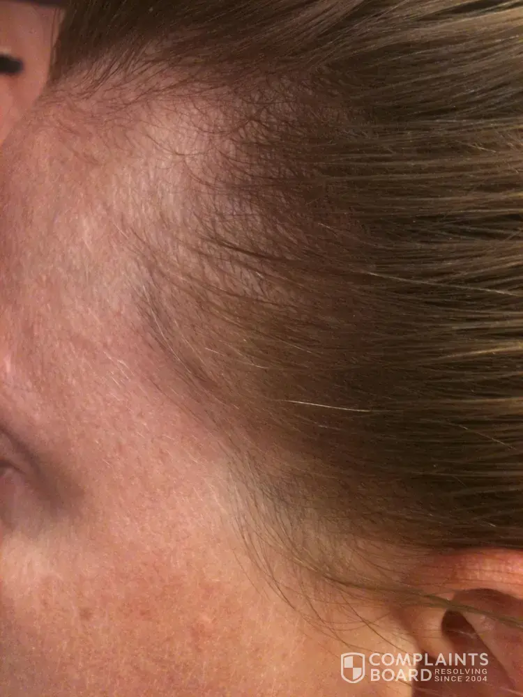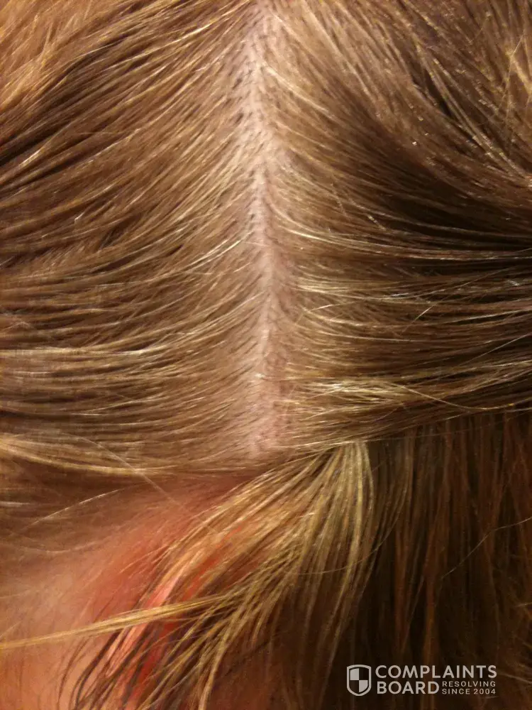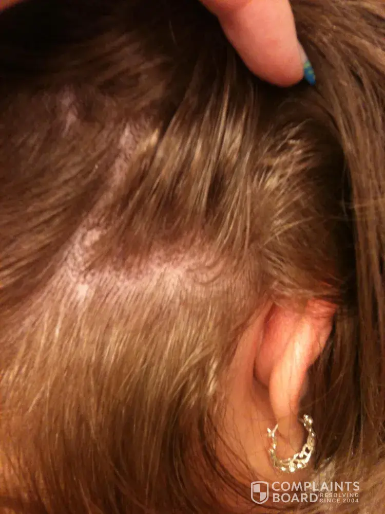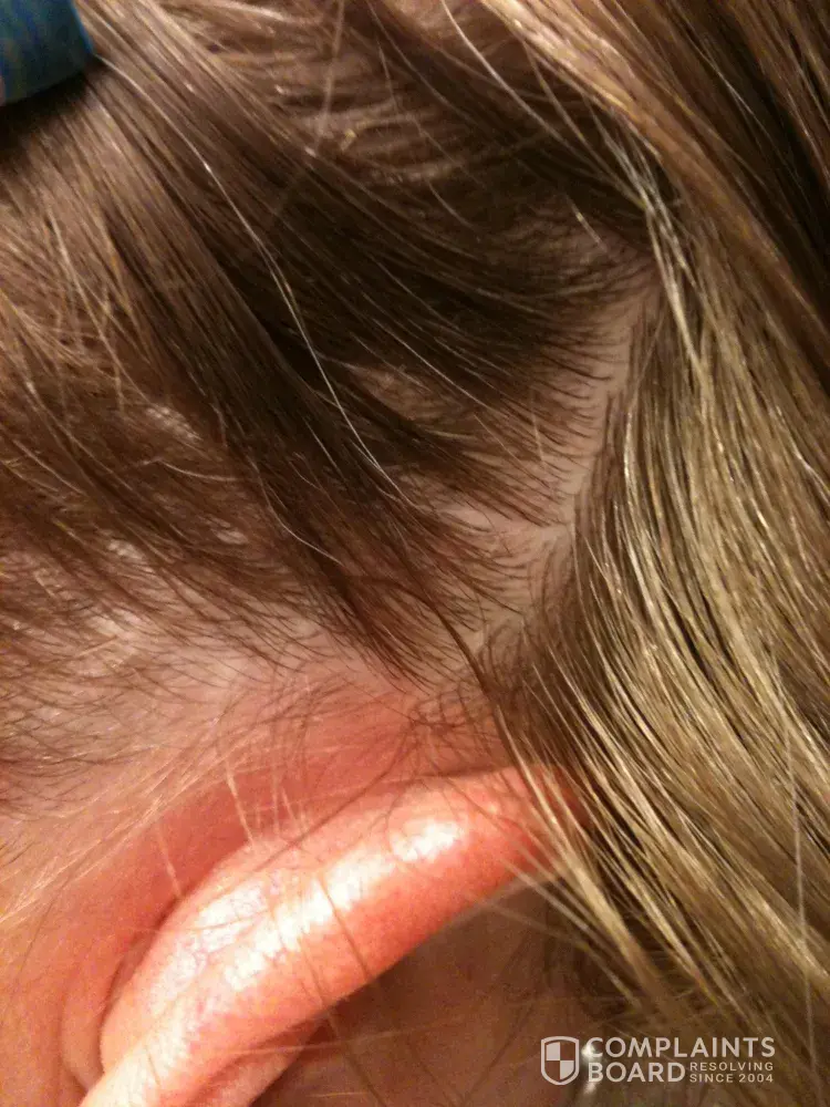 Empire School touched up my roots on 7/15/2010 around 3:20pm. No patch test was done by the student or the (1) teacher who was overseeing several students. The teacher, not the student mixed the product and toner. The roots lifted very fast but came out orange/red. (I did state on several occasions that my hair pulls red but not to the teacher). For an extra charge, Toner was added to deal with the orange/red roots. The toner almost immediately brought the color down to an acceptable light brown. During the initial root lift I noticed the product smelled strong and tingled a bit. The toner appeared to cool things down and my hair was smooth and looked good when I left. My scalp continued to have sensation of burning especially around ears and back of neck. Hair thin and extra un-naturally silky texture to my hair. This burning sensation became unbearable on Monday 7/19/2010 and caused me to call ER at 2:00 am to ask questions to help determine if I needed emergency care. I was unable to see red but by late morning my head was on fire and red. I went to another salon who took the photo's below and applied protein conditioner. I also had to cut /layer my hair about 2.5 inches so as to avoid further strain on scalp by pulling it back into a pony tail. I am not sure if I am going to lose my hair. I only hope that it will grow back. I understand this is a school and that you sign waivers but I do think Empire should take some responsibility as they are not doing patch testing and have really burned me. I am told the product used was Goldwell - 20 volume perm and the toner was a semi perm by Goldwell. Something went terribly wrong. Agonizing pain. I hope it goes away soon!
