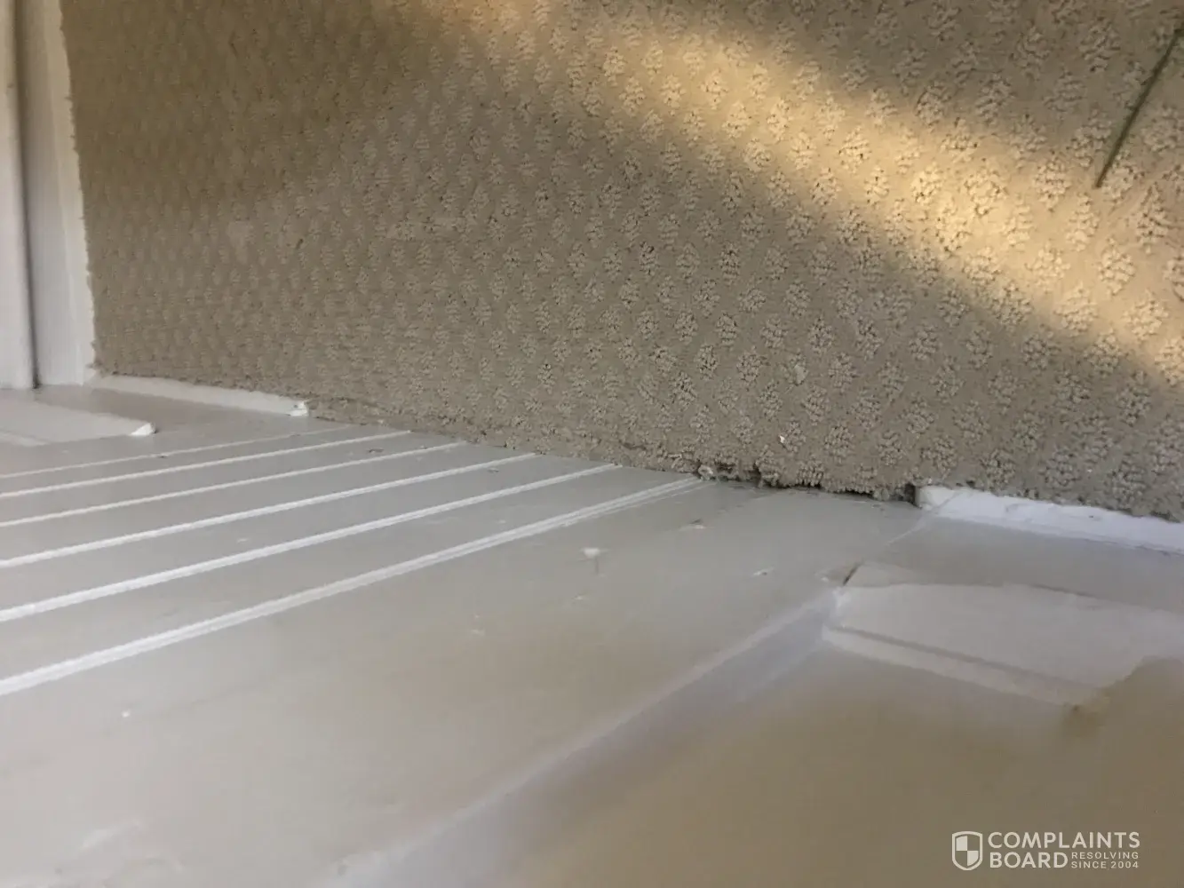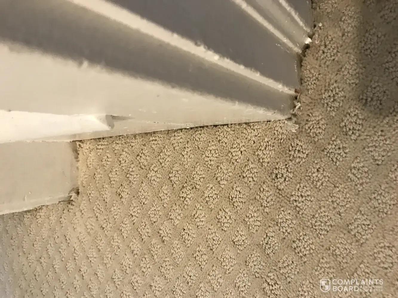 Nearly every wall seam has frayed edges or gaps which are extremely noticeable in our looped carpet. You can see knife marks where the carpet was cut, and there are huge gaps around almost every door jamb. The seams along the stairs are fraying and not tucked and will certainly continue to fray over time. There are many areas where the carpet ripples under foot and I am concerned this will cause wrinkling or bubbling down the road. Some spots have inexplicable holes along the edges, and we can also feel the tack strips through the carpet in a few places along the wall. They also skipped padding in all of our closets even though we specifically requested it.