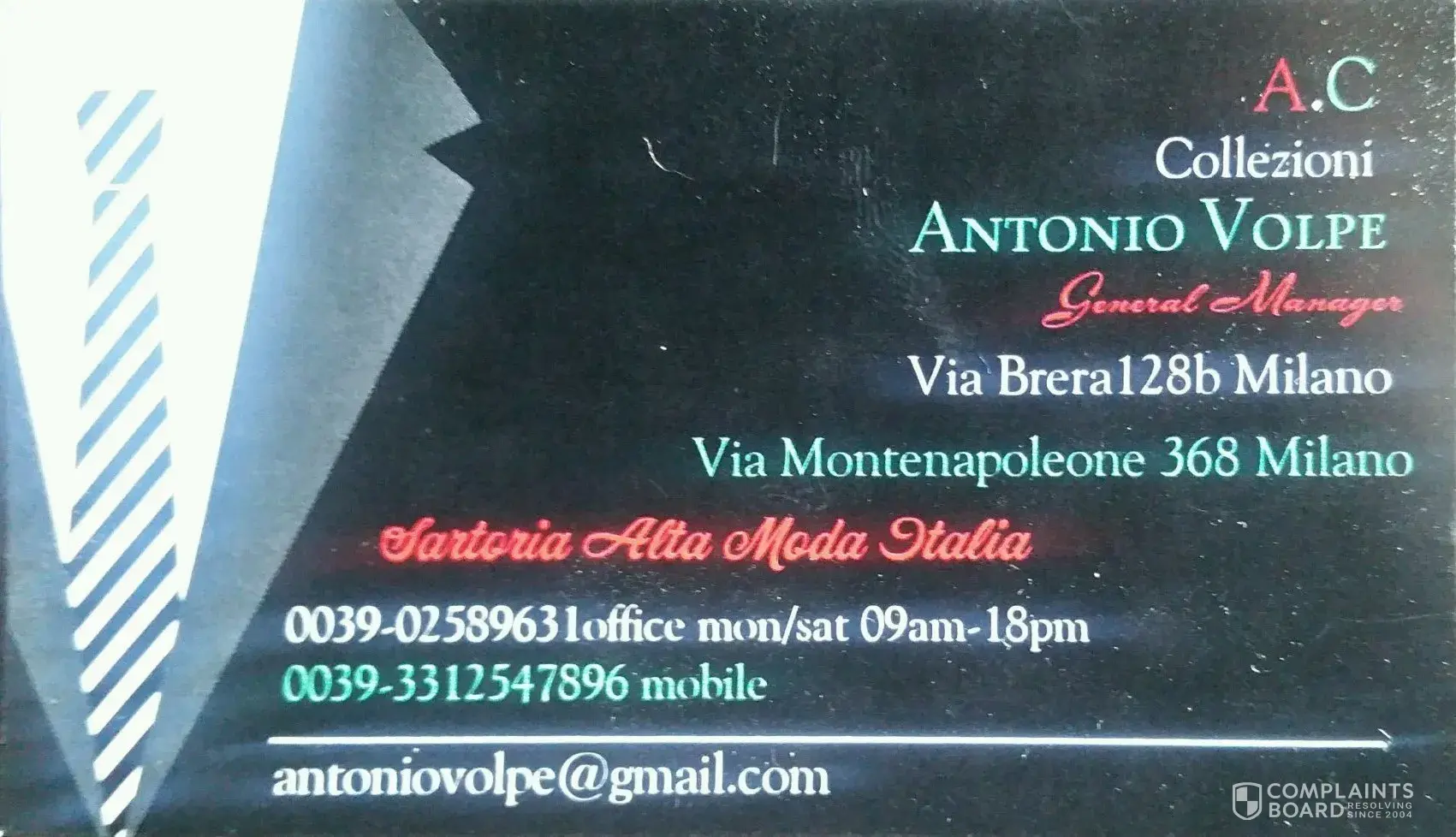 Sorry, for some reason the pic of his card isnt uploading. Its got the name "Mr. Antonio Dell Algida", he claims to be a designer for Armani, email is "antoniodellalgida@emporioarmani.com". Address "VIA. MONTE, NAPOLEONE. 10, MILANO" Mobile "+[protected]" Fax " +[protected]"
