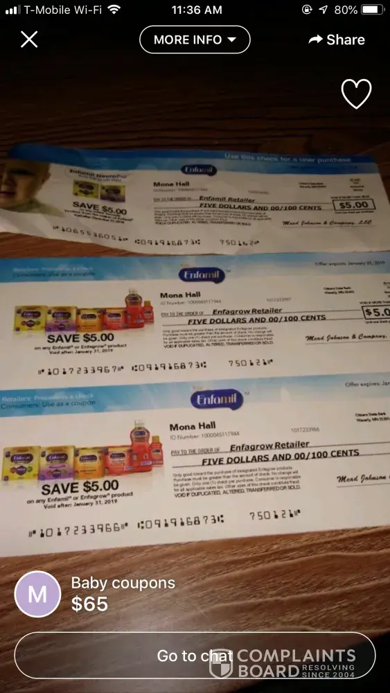 Sick of seeing people illegally selling checks or reselling formula samples! Enfamil should take her off the list immiedietly and send your coupons and checks to someone who actually needs them and will use them in the way they're meant to use. Stop supplying checks and samples to scammers like this woman!