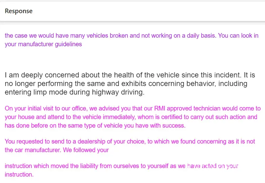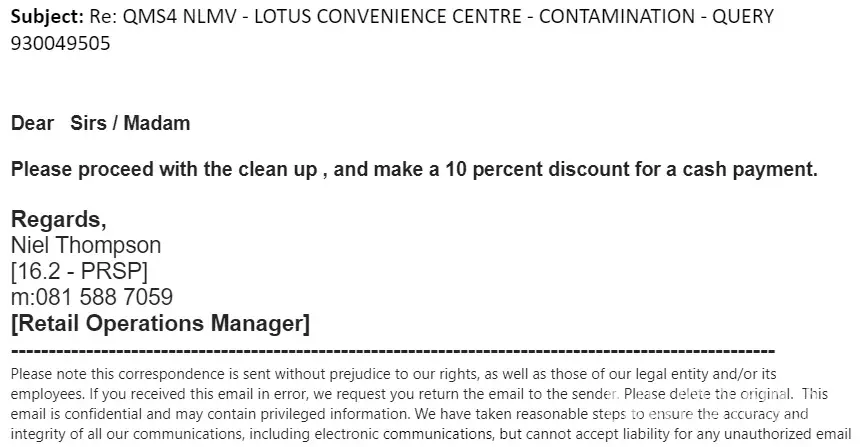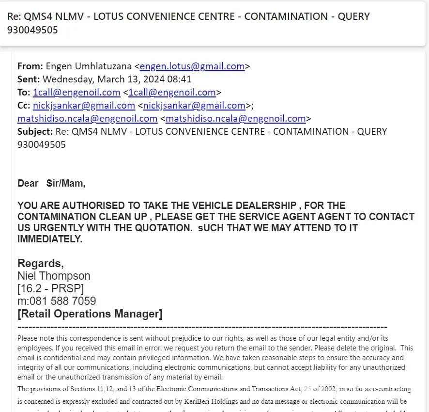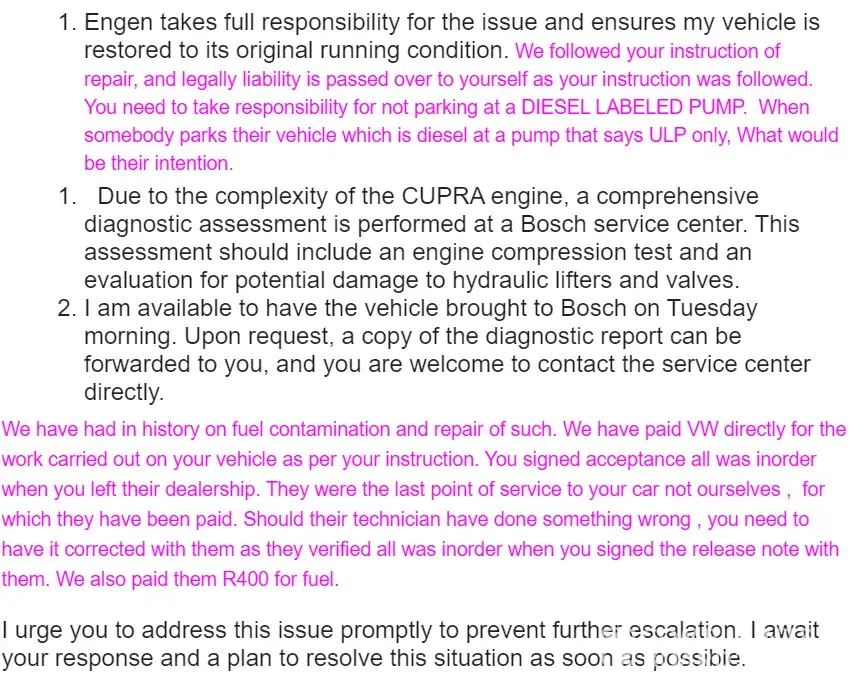 I then pay for the fuel and head home (100m Away). Within 50m the vehicle switches off and refuses to start, I then go back to the garage after opening my fuel cap and smelling petrol. They then check the footage and keep me waiting up to 30 mins only to speak to its owner, Nishal via a Phone Call. who doesnt know how to speak or to run his garage, his attitude is that its his business, his garage, I should shut my mouth and listen. We end up in a heated arguement and I leave the garage and contact Engen head office, Head office greases Nishal and then I suddenly get approval via email to take the vehicle to its dealer. (Shown Below)