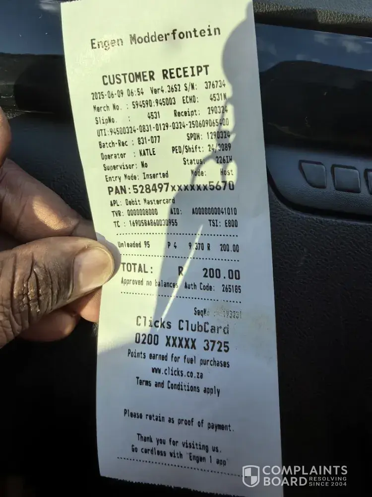 I always refill at Engen garage in particularly the Engen Midway, I am holder of Clicks loyalty cards (No. [protected]) see attached my recorded, I always use my Clicks' card loyalty programme that has my full contact details; hence my docket had my cell number and Gauteng home address. Engen Midway never took an effort to call me and enquiry about the payment that was not cleared.