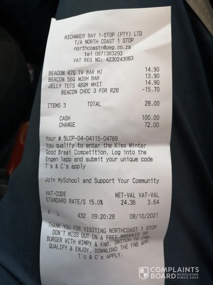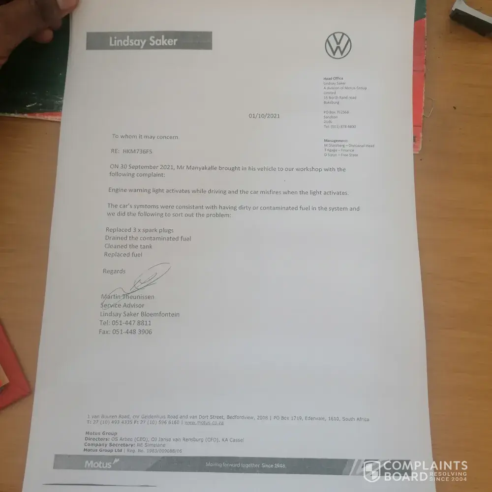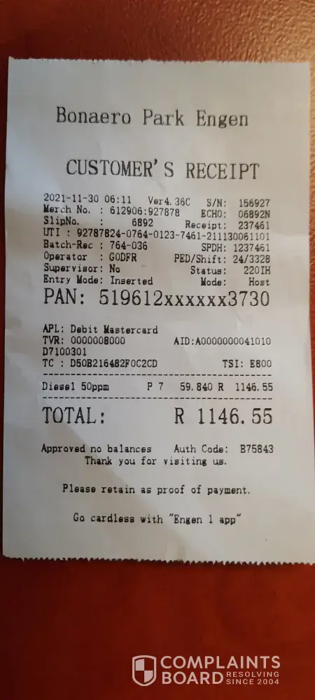 On the 30th September 2021 i filled the petrol from Engen in Bloemfontein next to Aljos spar, after i left the garage the car started to give me problem. The engine warning light was on, i took the car to VW they discovered that the car is having dirty fuel. I had to pay R 4 816.05. Because the Engen manager refused to take responsibility.