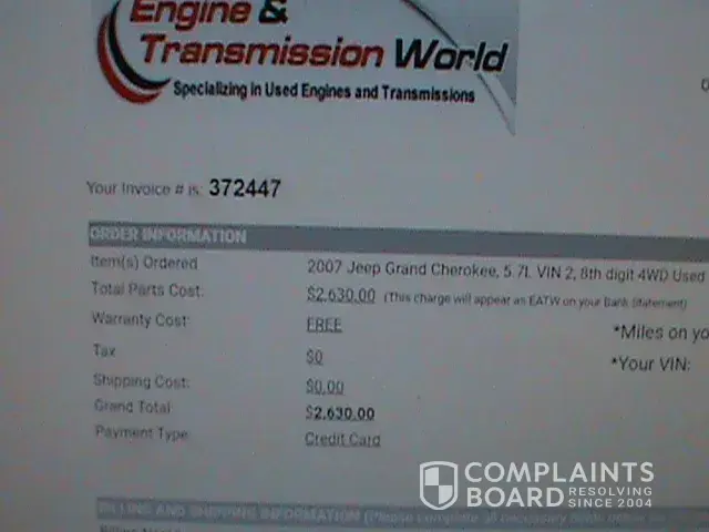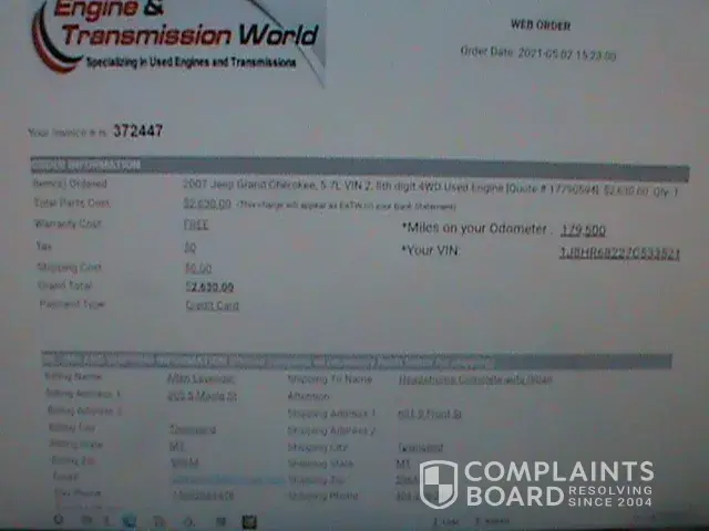 Ordering was easy but once the engine arrived I began to have my doubts, not to mention that it showed up way later than they said it would. I took off the valve cover to inspect further and the engine was full of sludge and the timing belt was cracked badly. Thinking that I understood their warranty terms I contacted them to tell them my concern and sent them pictures of the issue. They agreed that the engine was bad and told me that they would send me a different one in 2 days. I didn't receive any other contact from them for over a week. At that point my customer contacted me and told me that due to taking to long and the poor quality of the first engine that they no longer wanted to get an engine from that company, they didn't trust them. Finally after several tries and getting hung up on I was able to get ahold of the warranty manager Scott. I told him that he hadn't sent me the second engine, and before I could tell him to just cancel the transaction he said that he couldn't send it until I emailed him permission, which I had 9 times before my customer changed their mind. He then promptly without letting me speak put me on hold. Then he came back and said the new engine would ship out on Monday. Well, I said, my customer no longer wants an engine from you, and I want to cancel the order altogether. Fine, he said angrily I'll cancel the order you'll get a bill of lading to return the engine and then I'll issue you a refund, and then he hung up on me. Now after waiting over a week, emailing them almost daily, and trying to call several times he never sent me any information on how to return the engine for my refund. Finally after a week and getting hung up on several more times I was able to find out that the refund had been issued but takes 7 to 14 business days but they would only be refunding 75% per their standard policy. I asked them why since they sent me a bad engine and she said that it was their policy and that my other option was to get another engine. When I tried to get more information she hung up on me. This one company has hung up on me more than all other hang ups put together in my life. At least it would only be 7 days until I get my refund, or so I thought. The very next day right before their closing time I received a happy email stating that my replacement engine was on it's way and giving me the tracking number. I immediately tried to contact their shipping department and got a busy signal. I didn't even know that still existed. So I called the sales department to try to get it cancelled and they said that they couldn't help me and the shipping is closed, then they transferred me to the shipping department. I left them a message stating that I do not want the replacement engine from them, I want a refund. And that is pretty much where I'm at today. I am a licensed auto repair shop, and I have no idea how that company is still in business. I will probably end up refunding my customer out of pocket for the bad engine, and have to eat over 1000 bucks not including time wasted. DO NOT PURCHASE FROM ENGINE AND TRANSMISSION WORLD OR ANY OF THEIR OTHER SITES. THEY WILL RIP YOU OFF AFTER THEY GET YOUR MONEY.