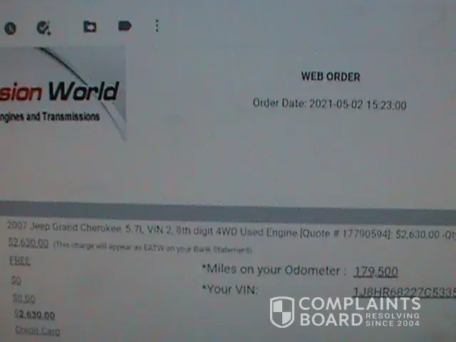 Ordered an engine for Jeep 2630.00 got an engine and it has a bad knock and valve train problems . they refuse to even try to resolve this. I believe they are as crooked as a business can be . They shouldnt even be able to do business and should be banned from the internet. I just want my money back. They say you have to use the email they send to get warranty but you cant download it, tried another computer same result. I think they do this purpose so you dont get a refund.