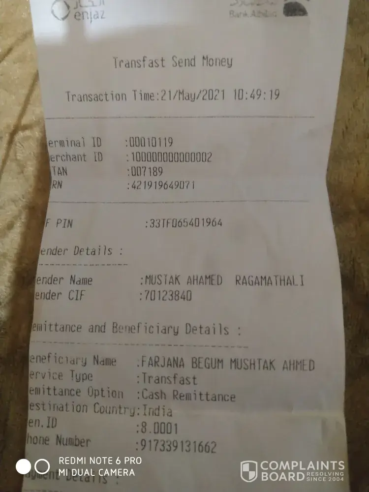 Hi sir iam mustaq Ahamed 21.05.2021 money sending India today de India account not sending money