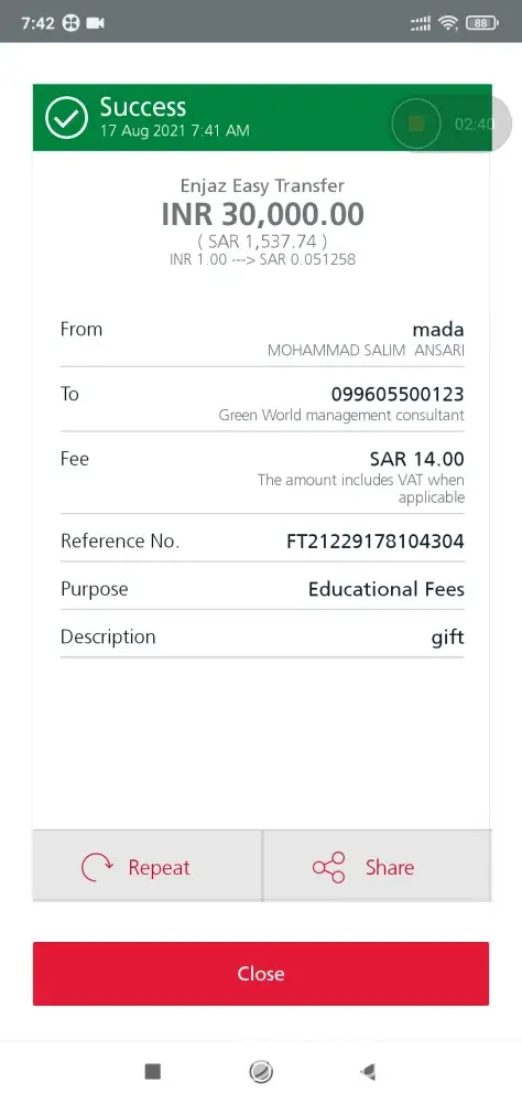 I send mony by enjaj app to mada card from al Rajshri, money is deducted but did not reach in India, transaction is suspended.