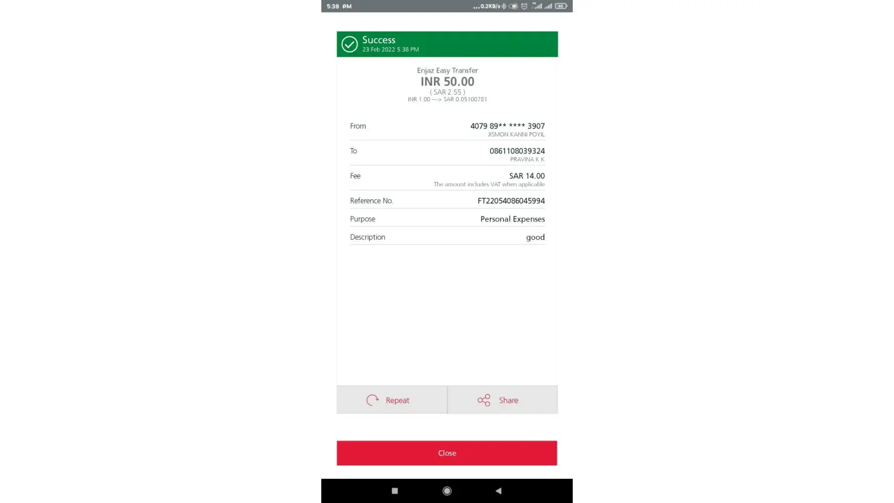 i have send money from enjaz application . with Reference no .Ft21290628105175. from app status show send . but when i checked the status of remittance it shows an error. kindly help me out.