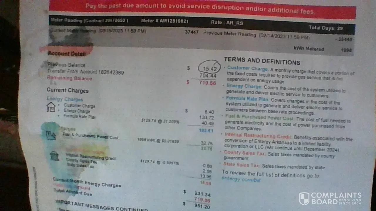 In april of 2022, my daughter's house burnt down. The utility company (entergy) came out that same day and disconnected the service. Because my daughter was on levelized billing at the time, (and all bills were paid and we were told that no other bill exists) entergy is trying to bill $704.00 for services that was disconnected by the power company, and she also called to get off the levelized billing in april of 2022. My daughter has two address accounts in her name, and instead of putting this bill (if it exists) on her current address, they are billing me for this and are currently scheduled for shutoff on april 26th, 2023. How can you bill a service for a residence that does not exist? I have two residences on our well pump, and if my electric gets shut off, the other residence will lose their water! I have filed a complaint with out attorney general hoping to get a resolution to this. Our phone calls get no where, and we are at our wits end! I am on disability and cannot afford to pay what they say we owe! My current bill is only 249.54 and is not due until may of 2023 and I should not be responsible for a service for a residence that does not exist!
