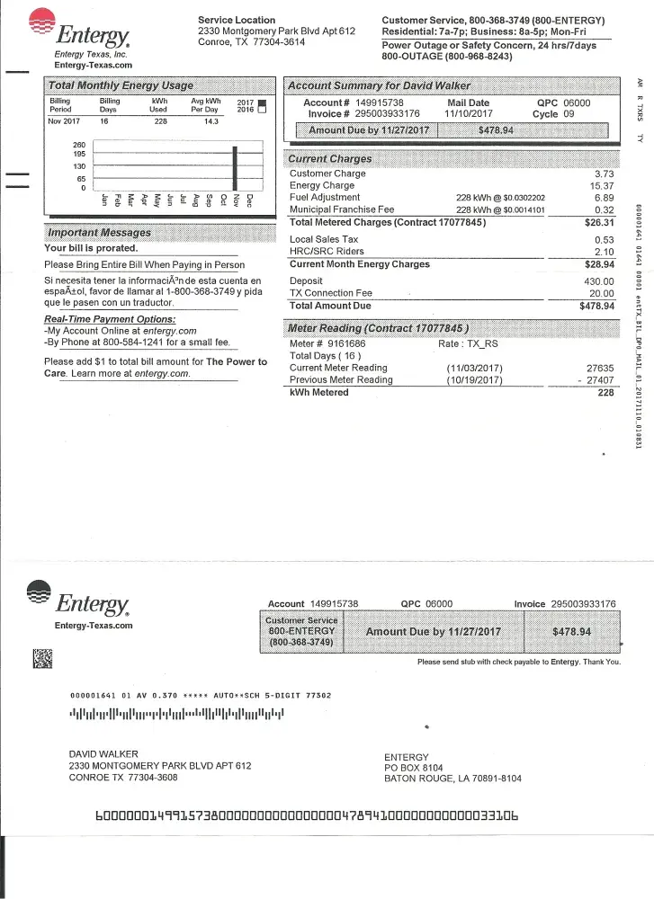 I was advised by Entergy personnel that I would be required to pay a unrealistic deposit of $430 based on previous tenants electrical consumption in a small apartment? Should my deposit not be based on my good creditworthiness or job longevity? I paid this deposit in addition to a $20 connection fee and my actual usage of $28.94 on 11/19/2017. There is a wrong here. You shouldn't be charged for a crime someone else committed. Like wise you cant assume everyone will consume same amount of electricity. Shame on Entergy!