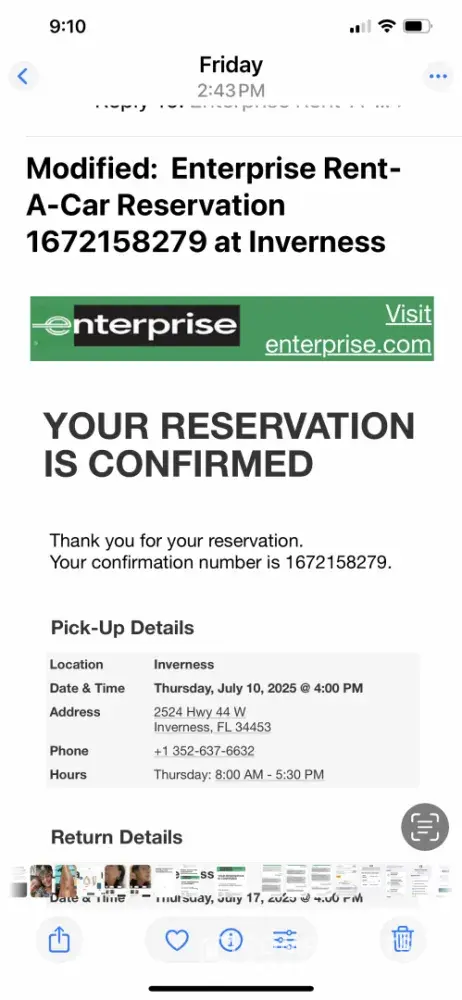 You reserved a Nissan Rogue or similar on Jun 9,2022 8:30:00 AM at Enterprise in Miramar. Your confirmation number is ***260.