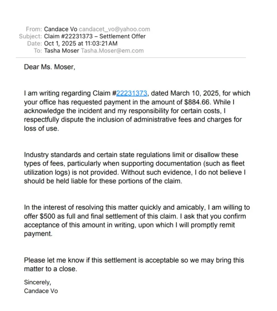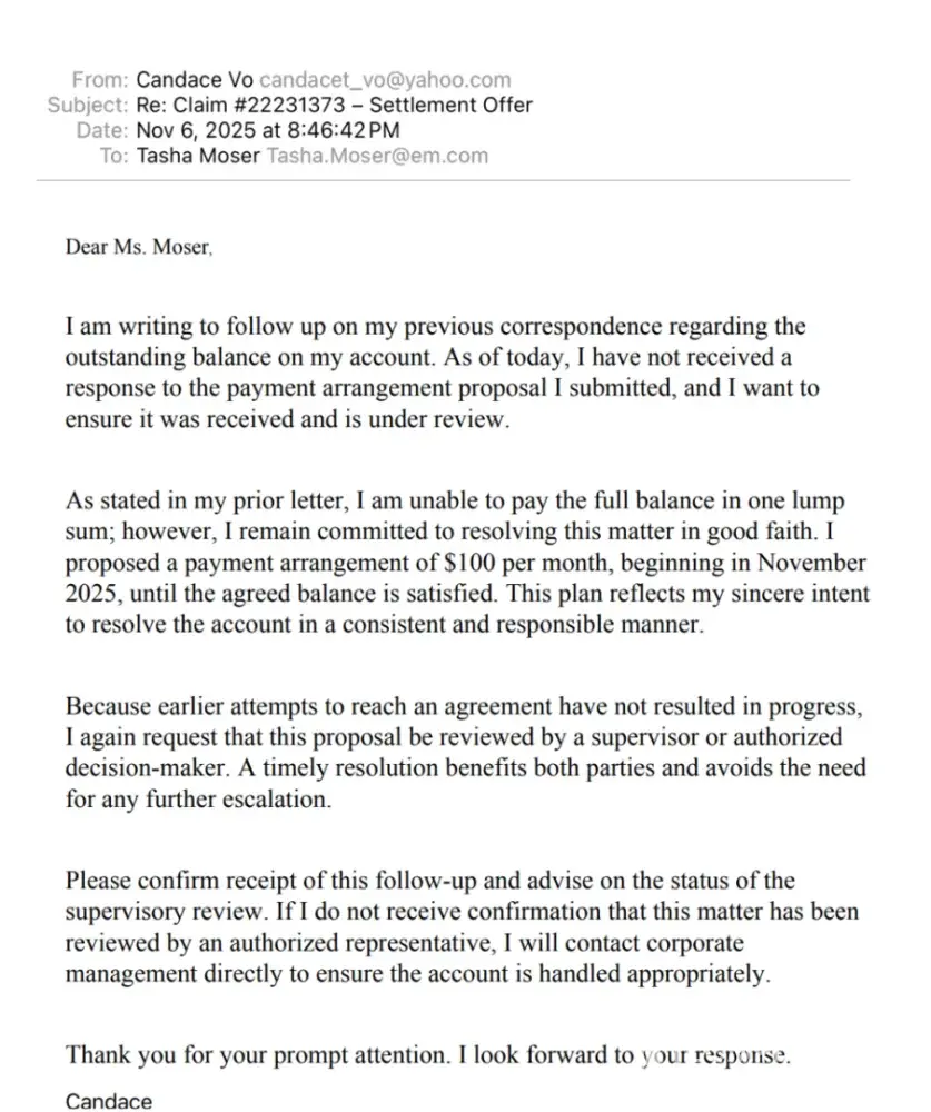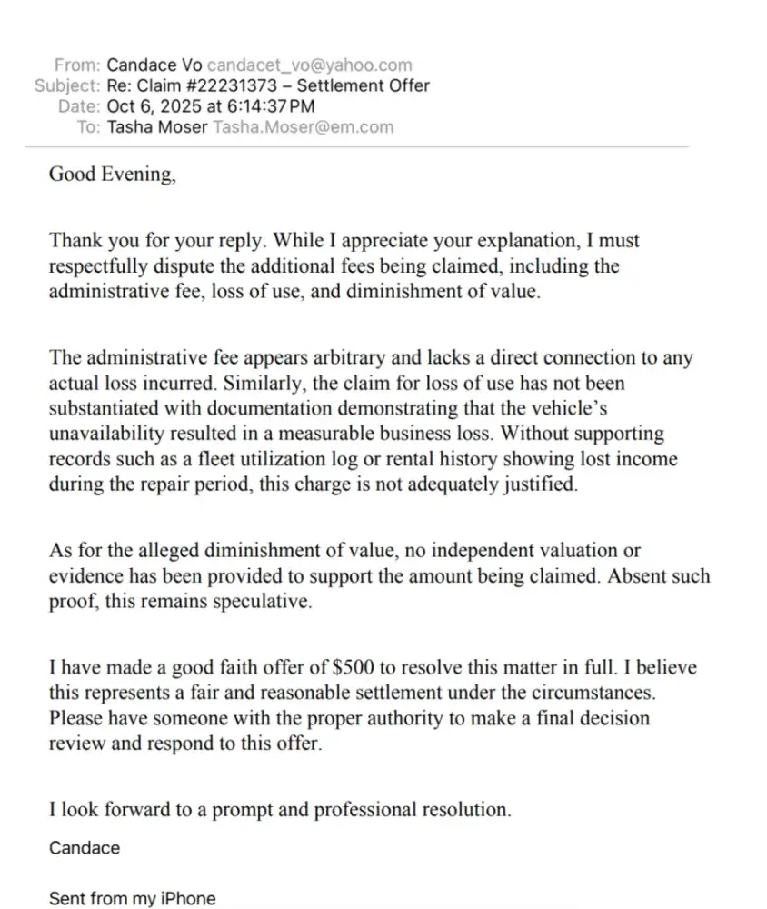 rented a car in Hawaii and was involved in a hit-and-run incident. I filed a claim with my insurance company, and part of the damages were covered. However, Enterprise added additional charges that I’ve been trying to negotiate for months. The representative handling my case, Tasha Mosely, has been extremely unresponsive and unprofessional — she ignored my payment offer and sent the account directly to collections without any discussion. I had offered to pay $100 per month toward the $800 balance and requested clarification on the extra fees, but they refused to provide any explanation.