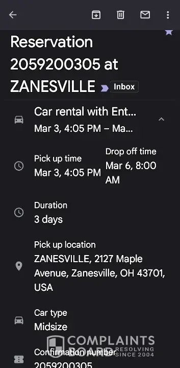 Below is a copy of the email confirmation I received from Enterprise. I made this reservation over two months ahead of my desired dates. I redacted my name for obvious reasons, but the dates, location and reservation number are listed.