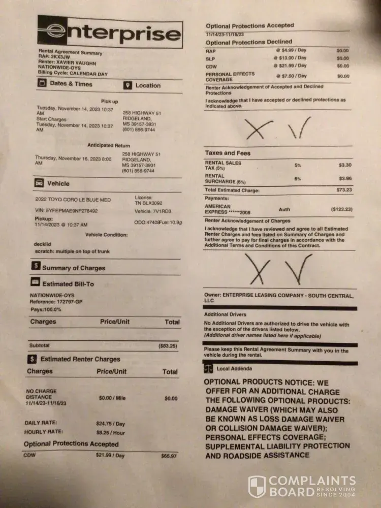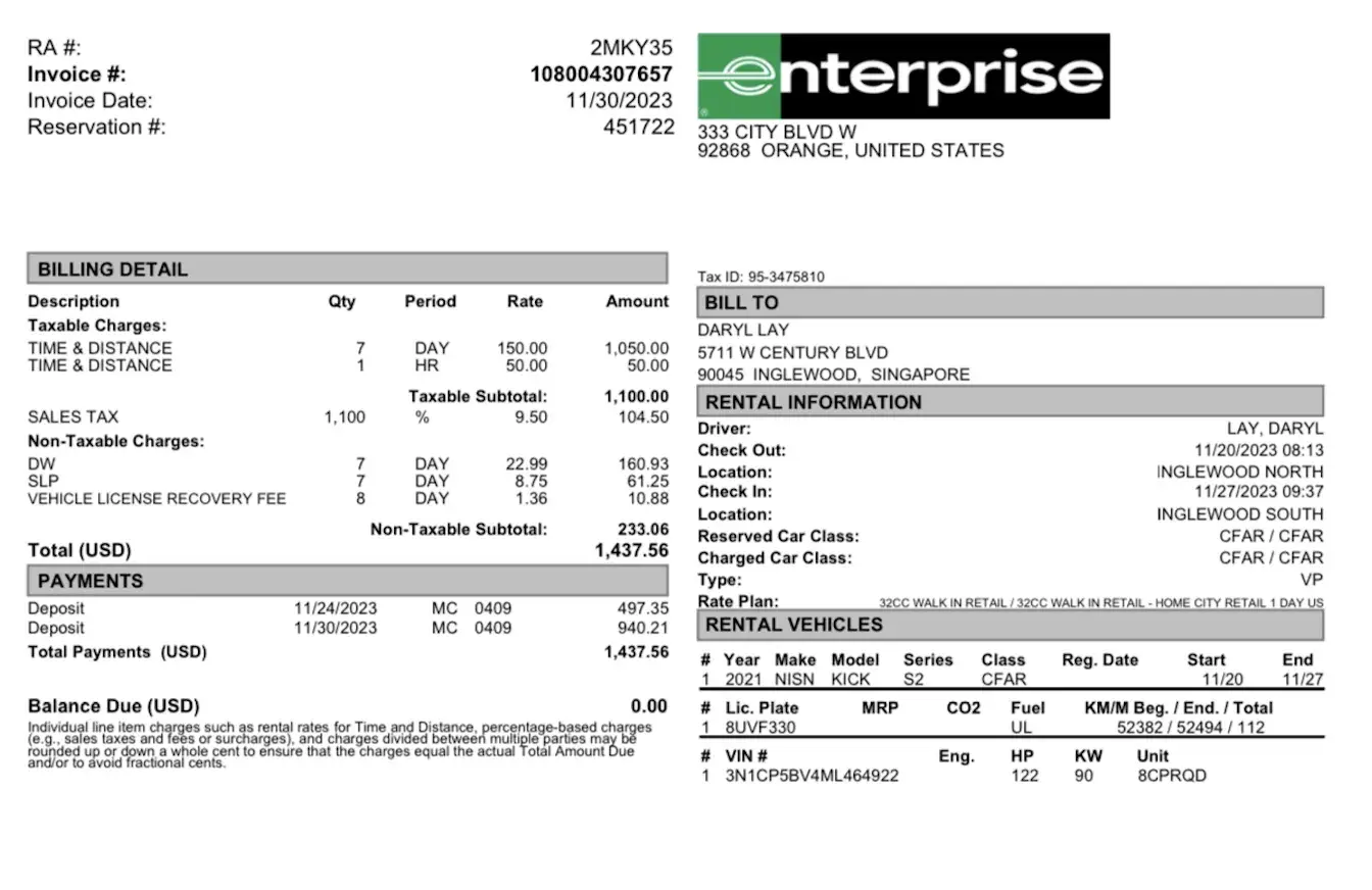 My name is Daryl Lay, and I rented a car for 24 hours with Enterprise on 24th Nov 2023.