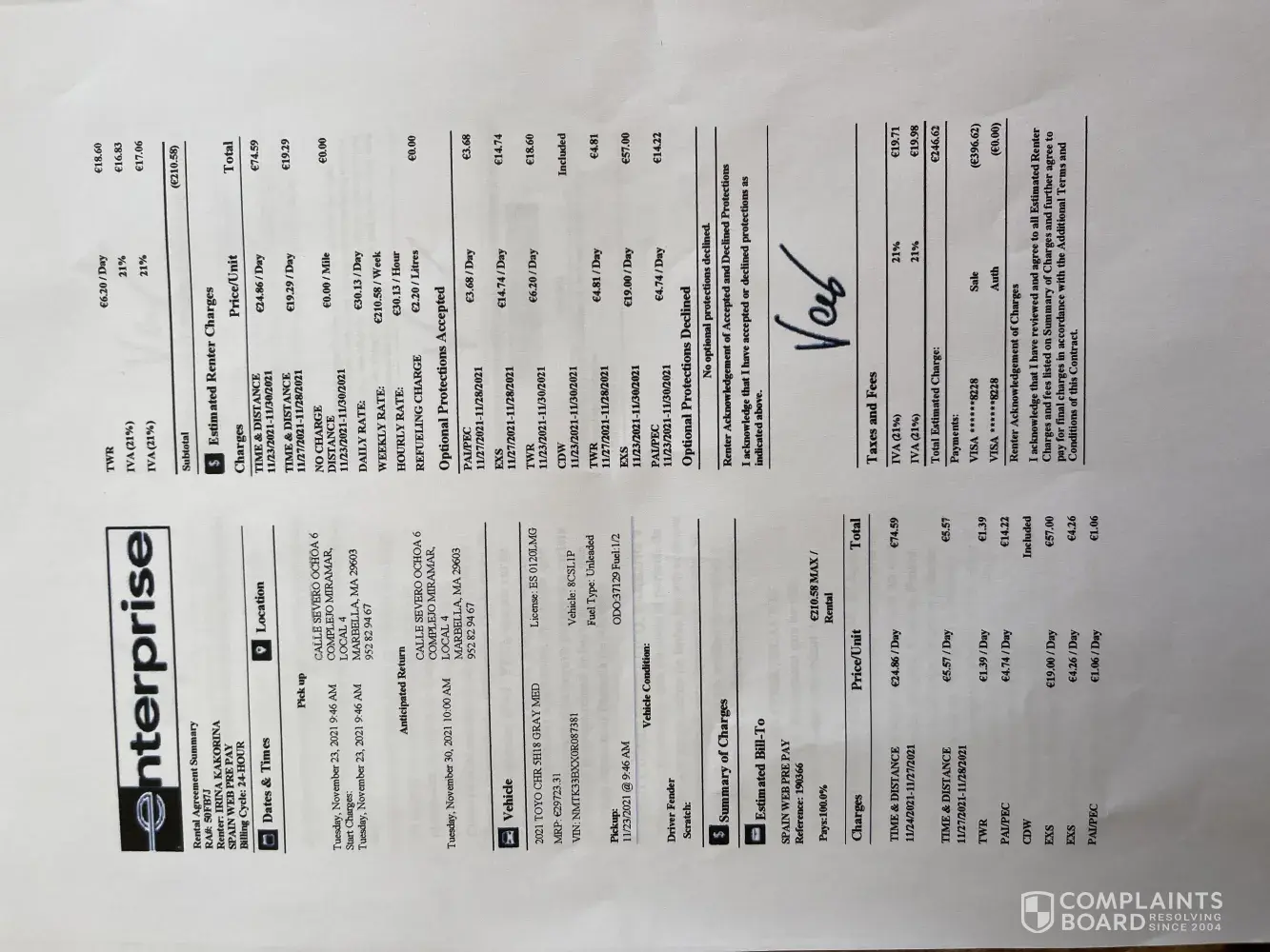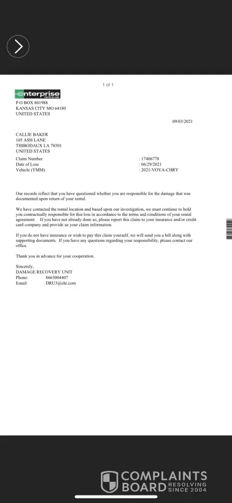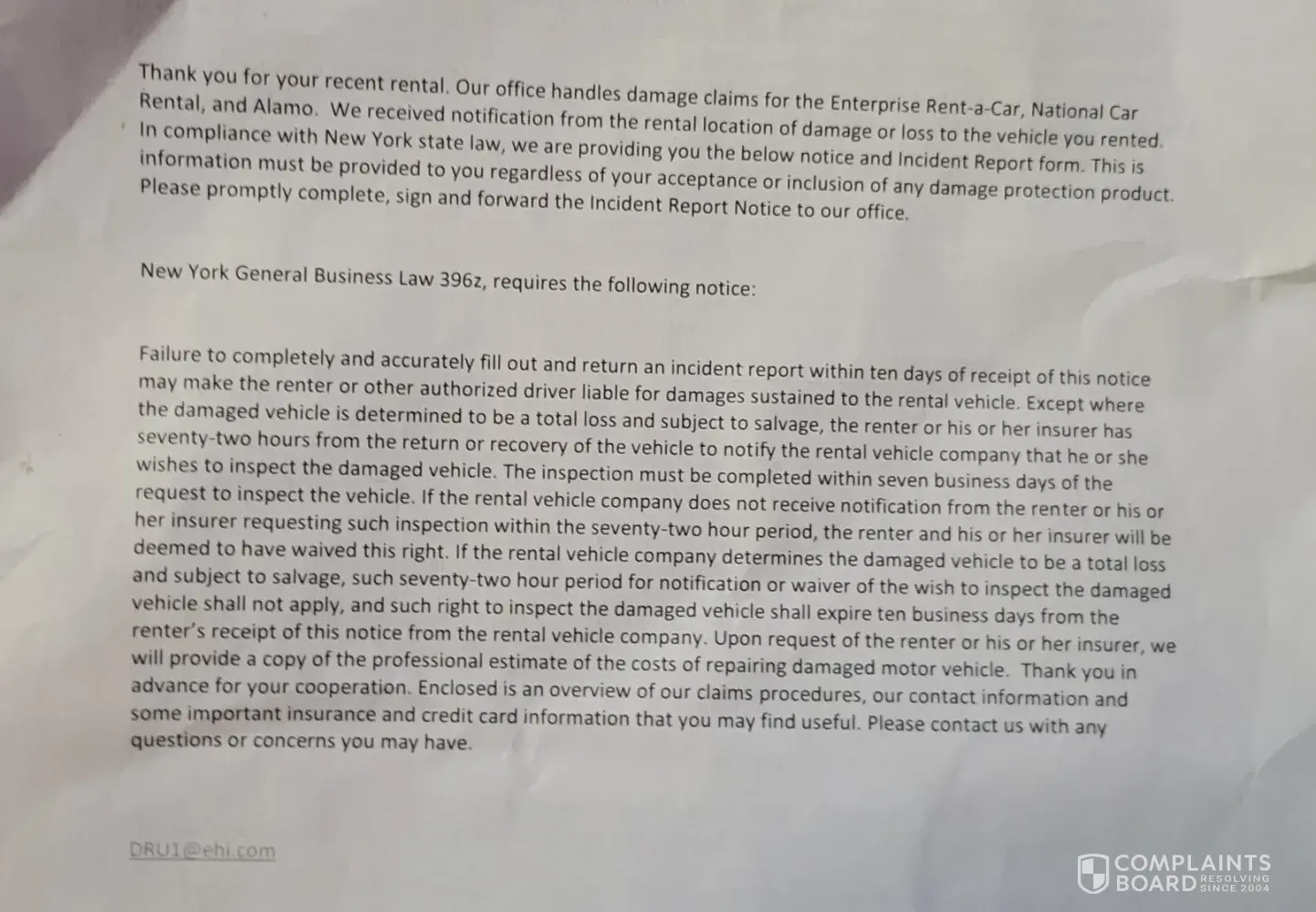 On November 23, 2021, I rented a vehicle from your Middletown, NY location before leaving I made the rep aware of cosmetic damage to the rear of the vehicle a note was made by the rep. On November 26, 2021, I returned the vehicle to your Vestal location with a full tank of gas and the only damage was the cosmetic damage that I made aware to the rep in Middletown, NY before I left the Enterprise lot. Today I get a FedEx letter with only two pages in it I have added them below. I had to search to find the company name that sent it and found it in the small print of the 2nd page. There is no address to send the incident report form that wasn't either there back to the company in small print. There is no phone number to contact these people either. So, can you explain to me how I am to dispute this within 30 days? They sent nothing, not the vehicle or what is damaged, so I can at least send them a proper dispute. And I will be disputing this because I caused no damage to that vehicle. I have never run across such an unprofessional company and am amazed Enterprise allows this shady incomplete and ridiculous attempt of looking for a quick buck. I have always trusted Enterprise but will now think twice before even looking towards your rental counter. Rental agreement #50KPQQ.